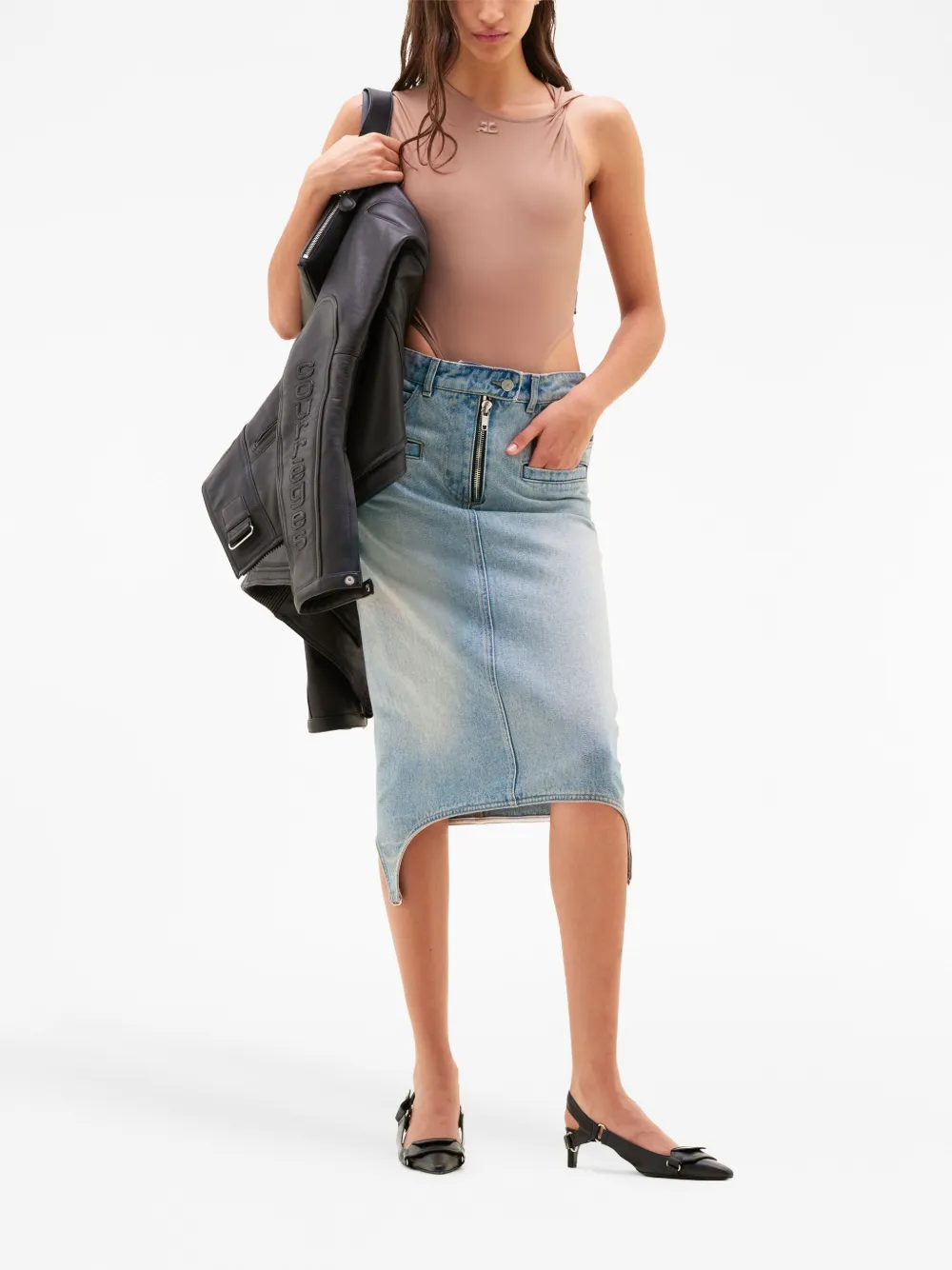 Gonna midi denim Courrèges. Modello con blu chiaro, cotone, denim con effetto schiarito, chiusura con bottoni, design classico a cinque tasche, due tasche a filetto frontali, lunghezza sotto al ginocchio e linguette laterali con fibbia.
