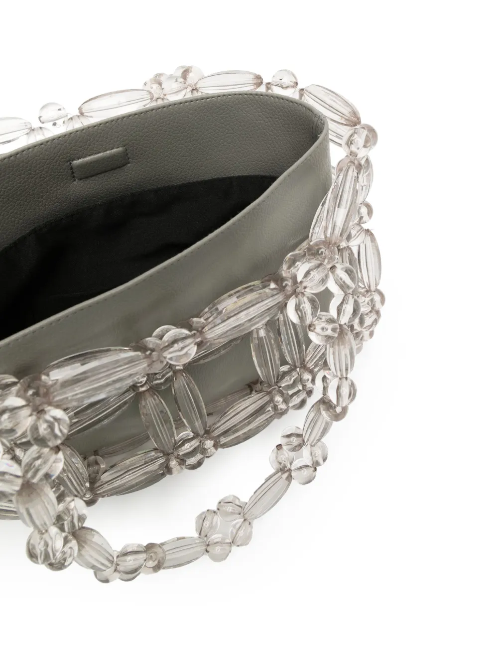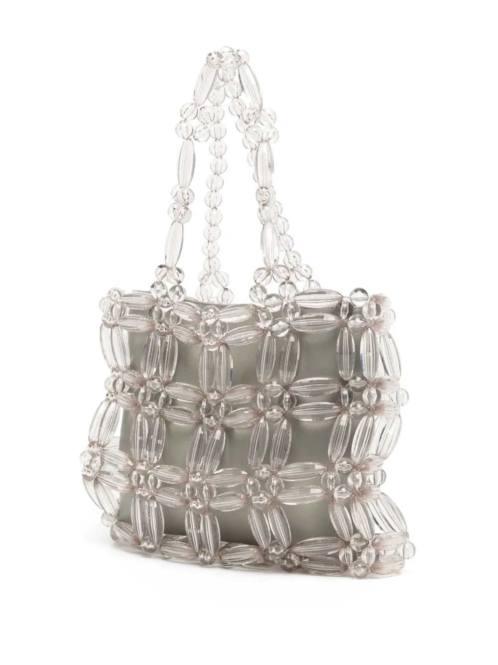 Grigio chiaro, design trasparente, decorazione con perline, chiusura magnetica, due manici e scomparto unico.
