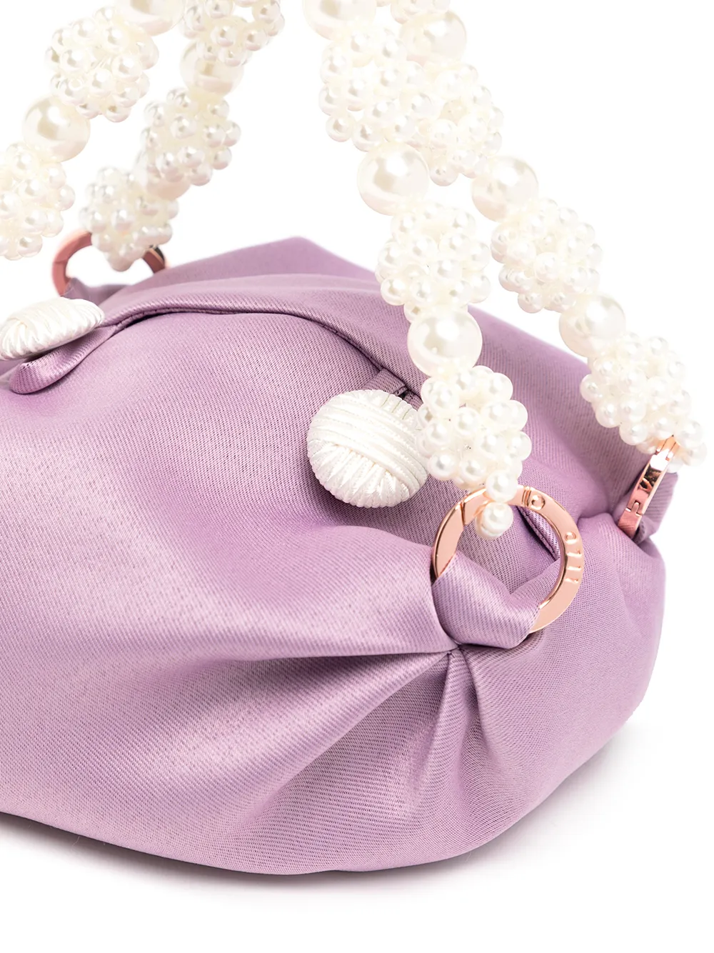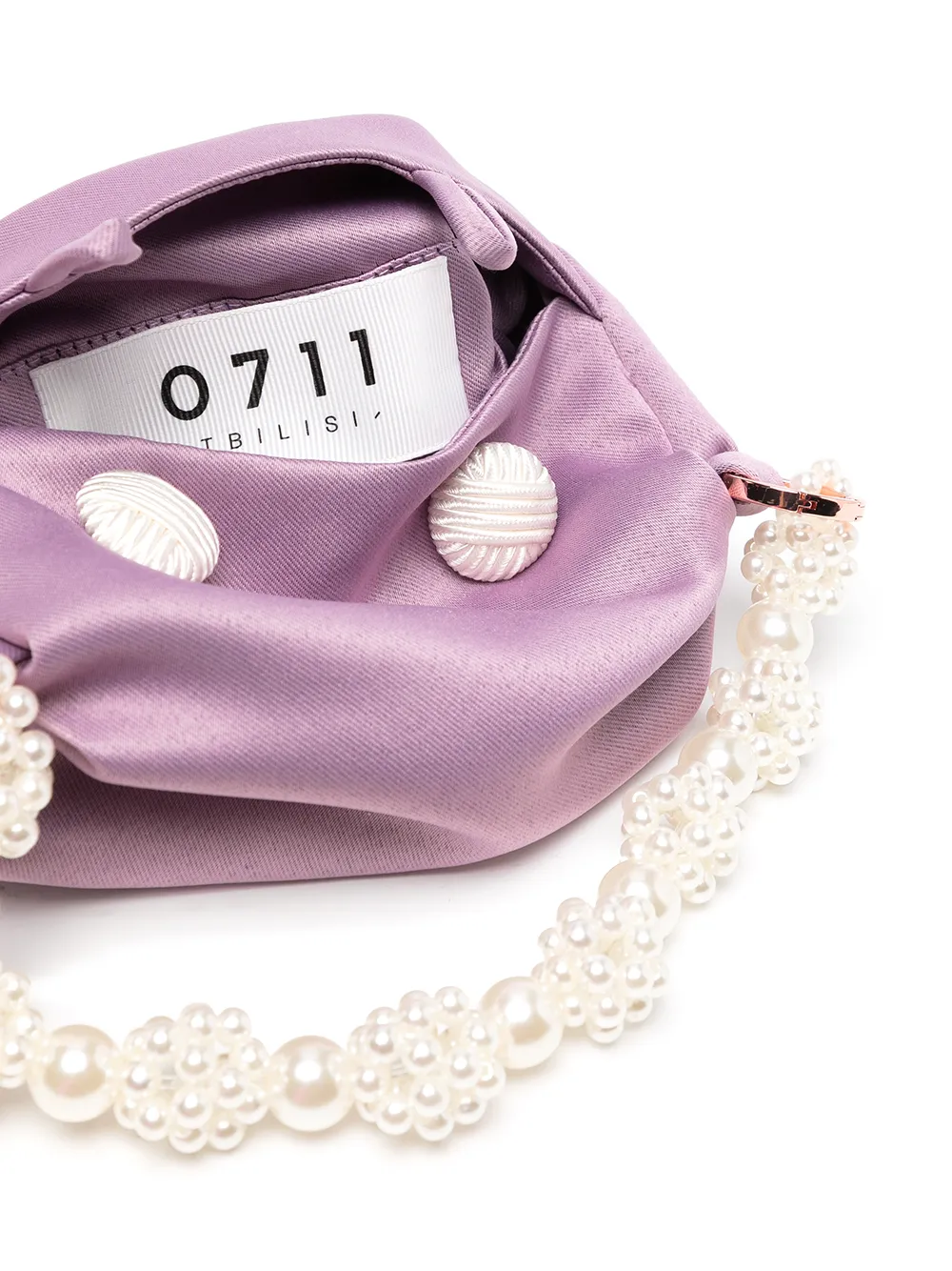 Dettaglio con perla, dettagli color oro, chiusura a bottoni e scomparto unico. Materiale: perle.