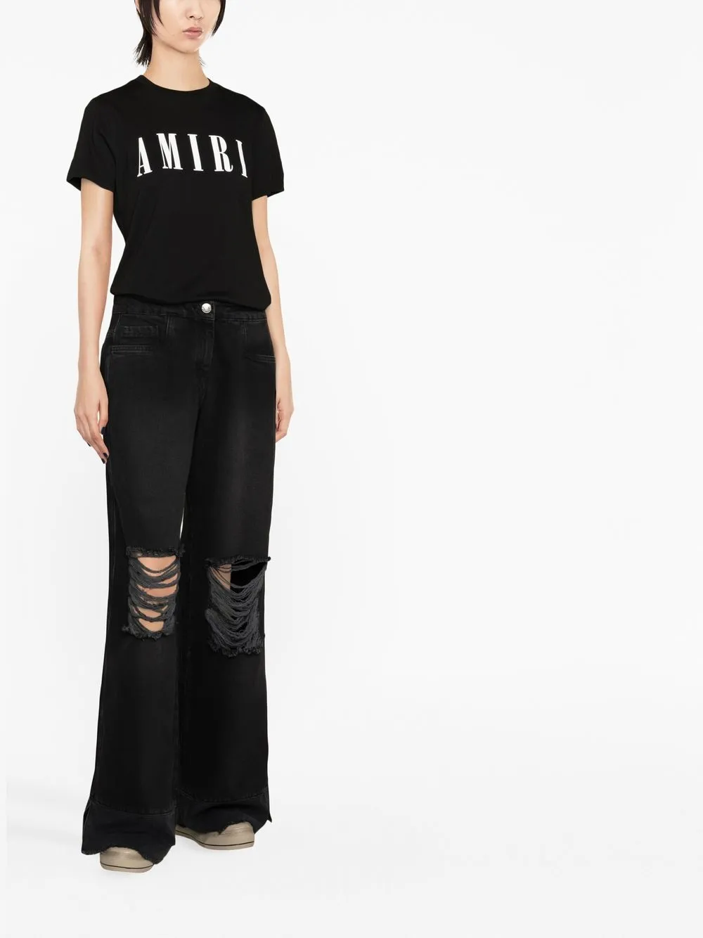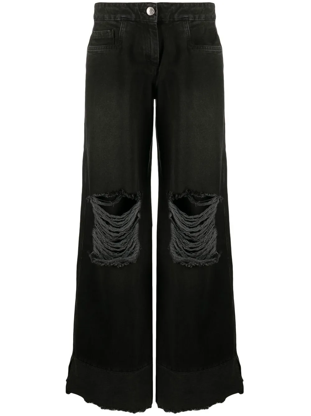 Nero, cotone, denim, dettagli con strappi, vestibilità gamba ampia, bordo con frange, vita media, chiusura con bottone e zip nascosta e design classico a cinque tasche.