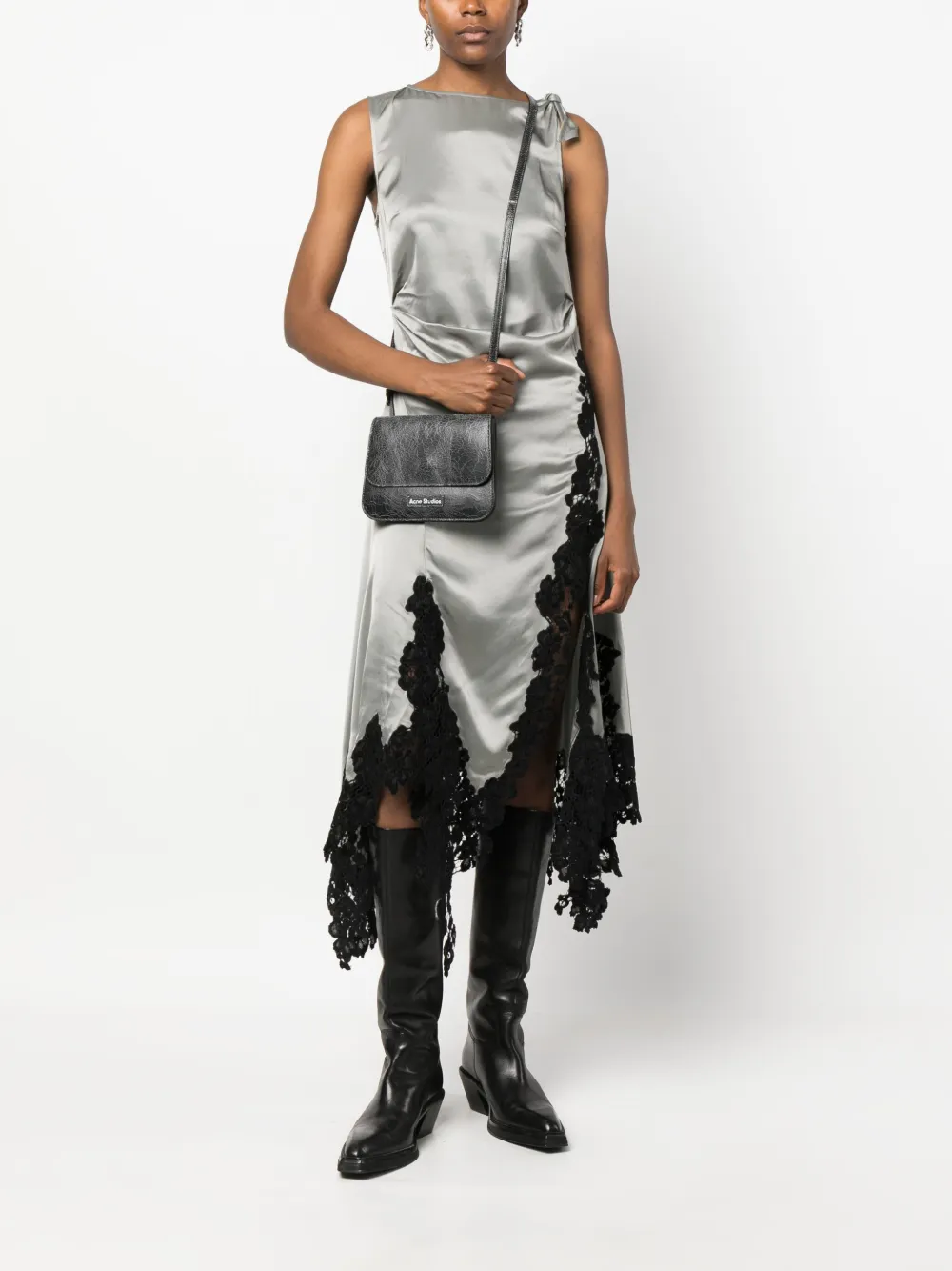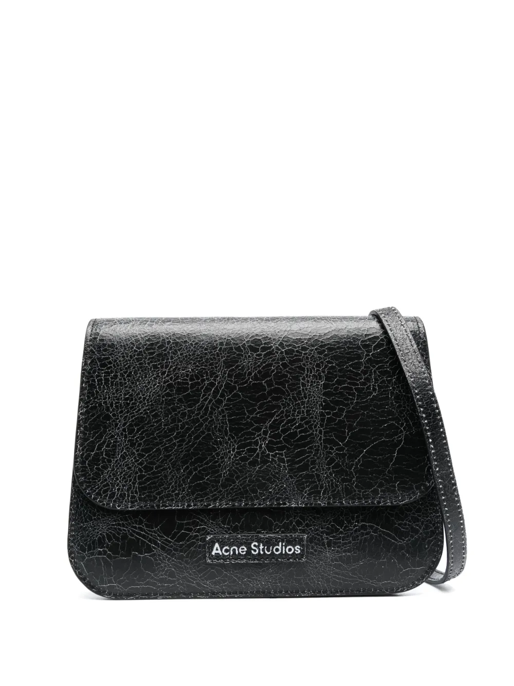 Nero intenso, pelle di vitello, effetto craquelé, gonna plissettata, applicazione frontale con logo, specchietto interno, battente nella parte superiore con chiusura magnetica, tasca interna a soffietto e scomparto unico.