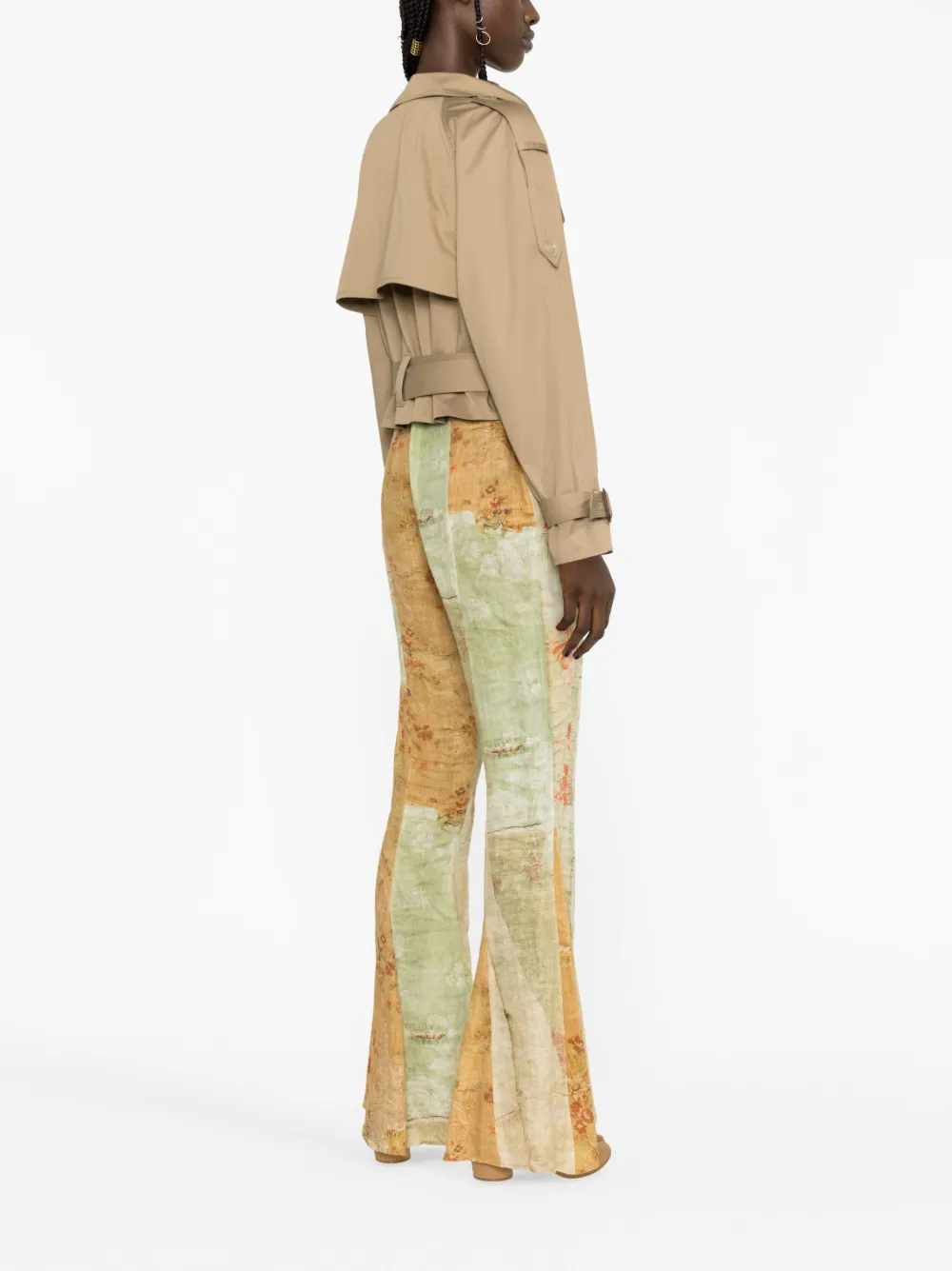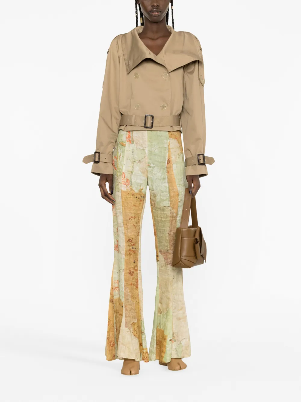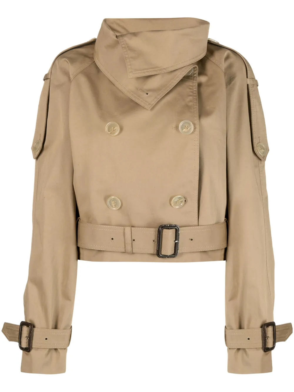 Beige, tessuto in twill, collo alto, chiusura doppiopetto con bottoni, spalline, maniche lunghe, modello con cintura, orli con cintura, pattina frangivento e design crop.