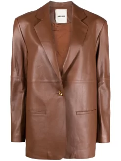 Cioccolato, pelle di agnello, revers classici, chiusura frontale con bottoni, maniche lunghe e due tasche a filetto frontali.