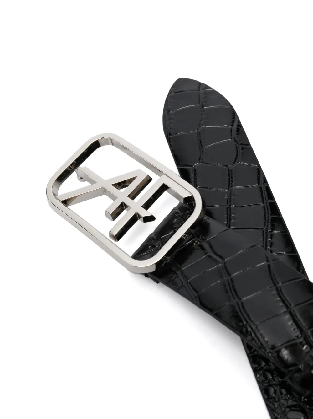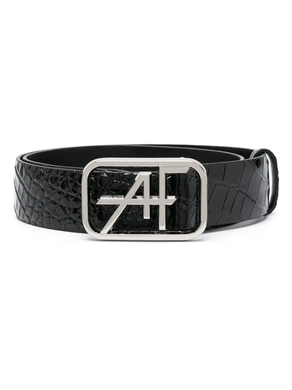 Nero, pelle di vitello, effetto pelle di coccodrillo goffrata, dettagli color argento, passanti, design a punta di diamante, chiusura con fibbia con logo e design regolabile.