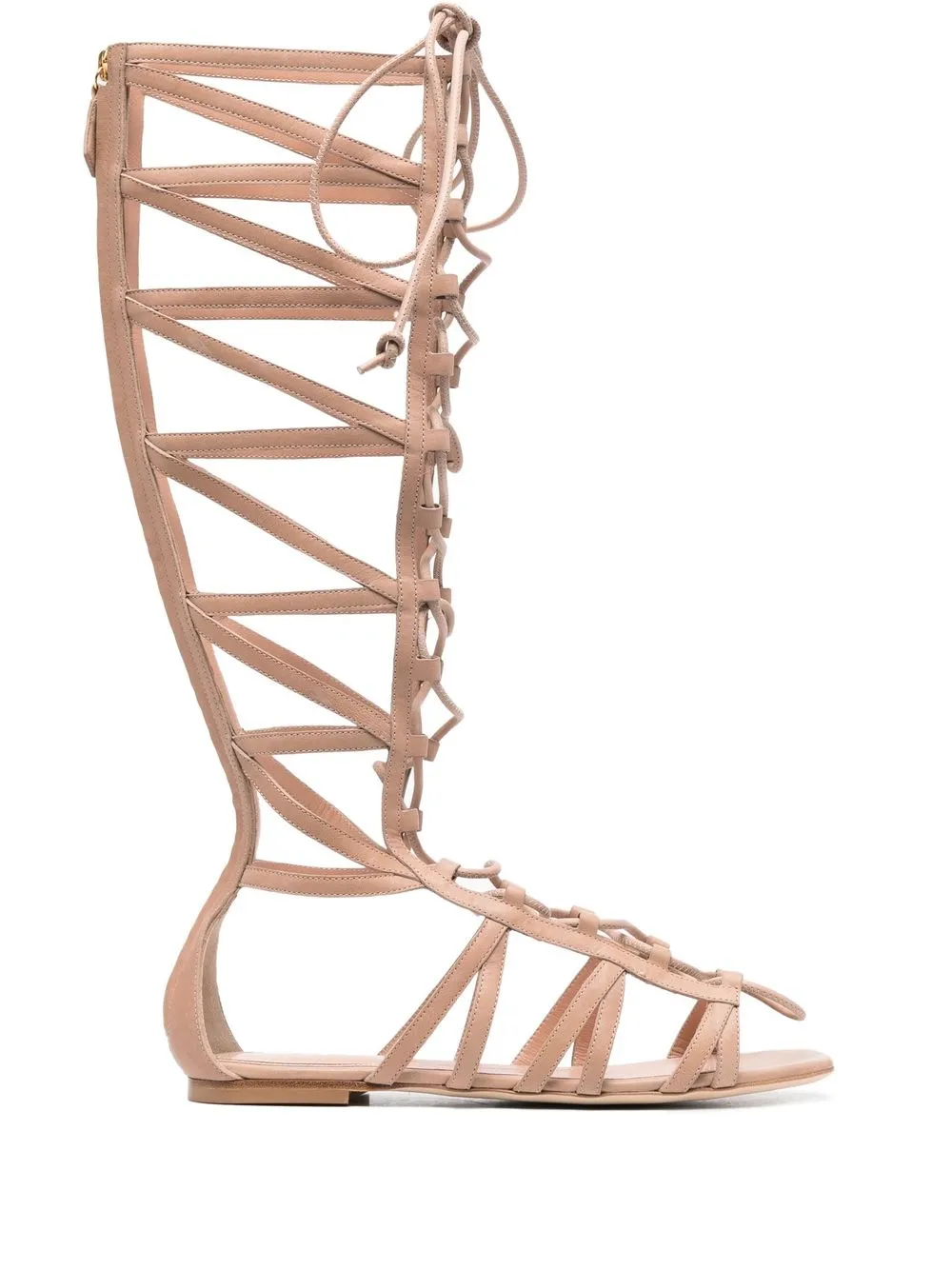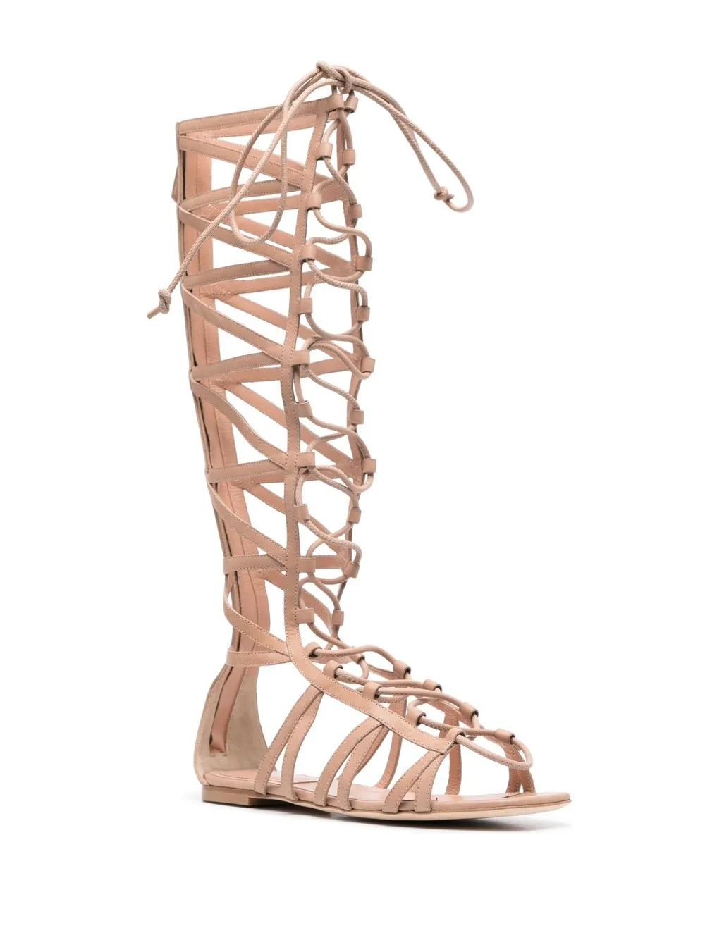 Beige, soletta con logo, tracolle sottili, punta aperta, chiusura frontale con lacci, lunghezza al ginocchio e suola piatta. Materiale: pelle.