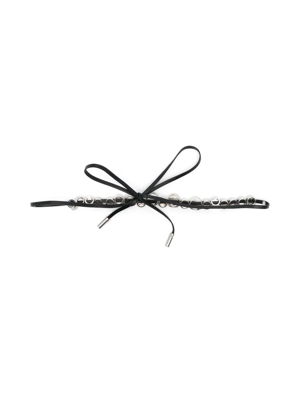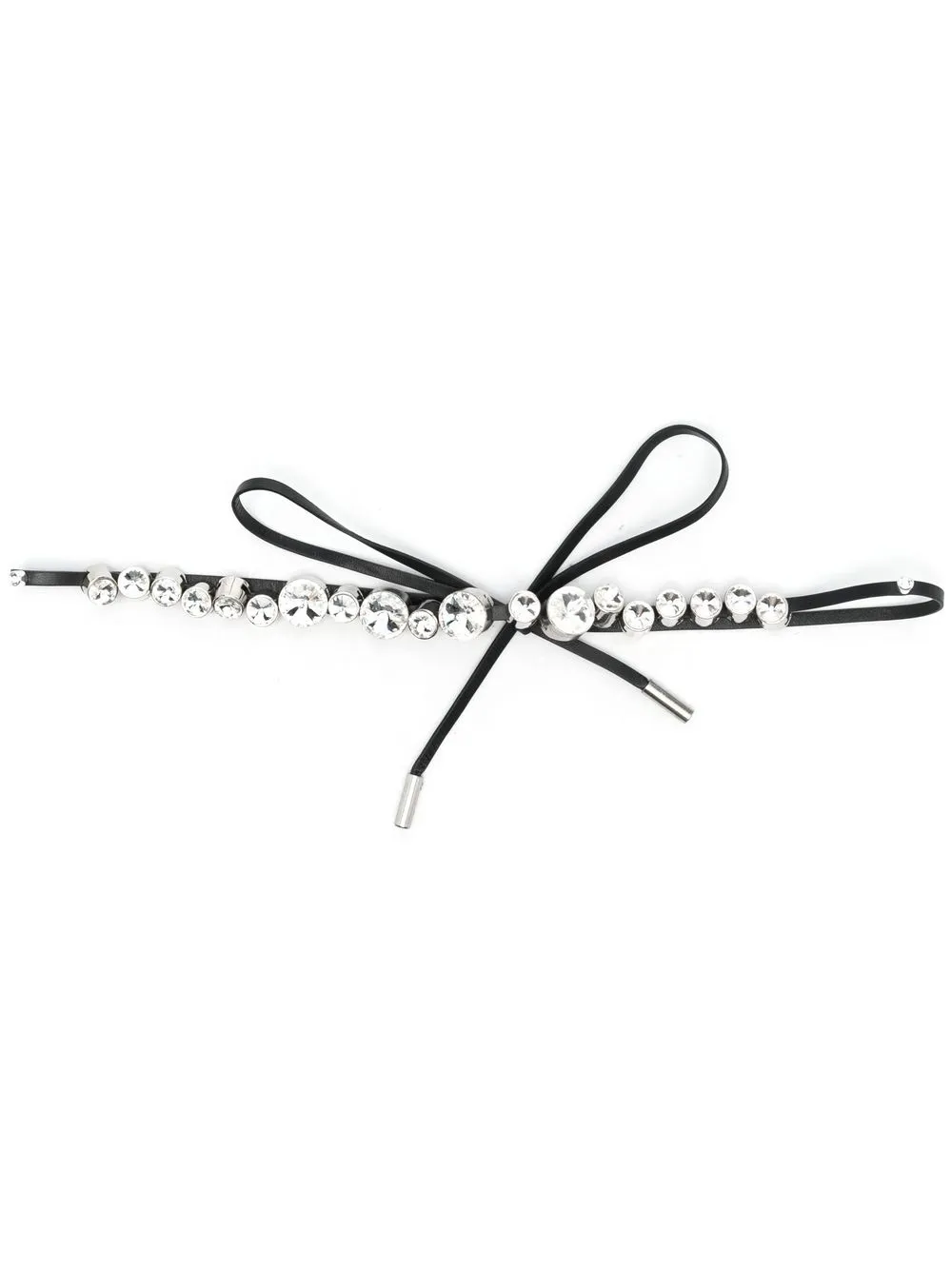 Pelle, decorazione in cristalli e chiusura con nodo.