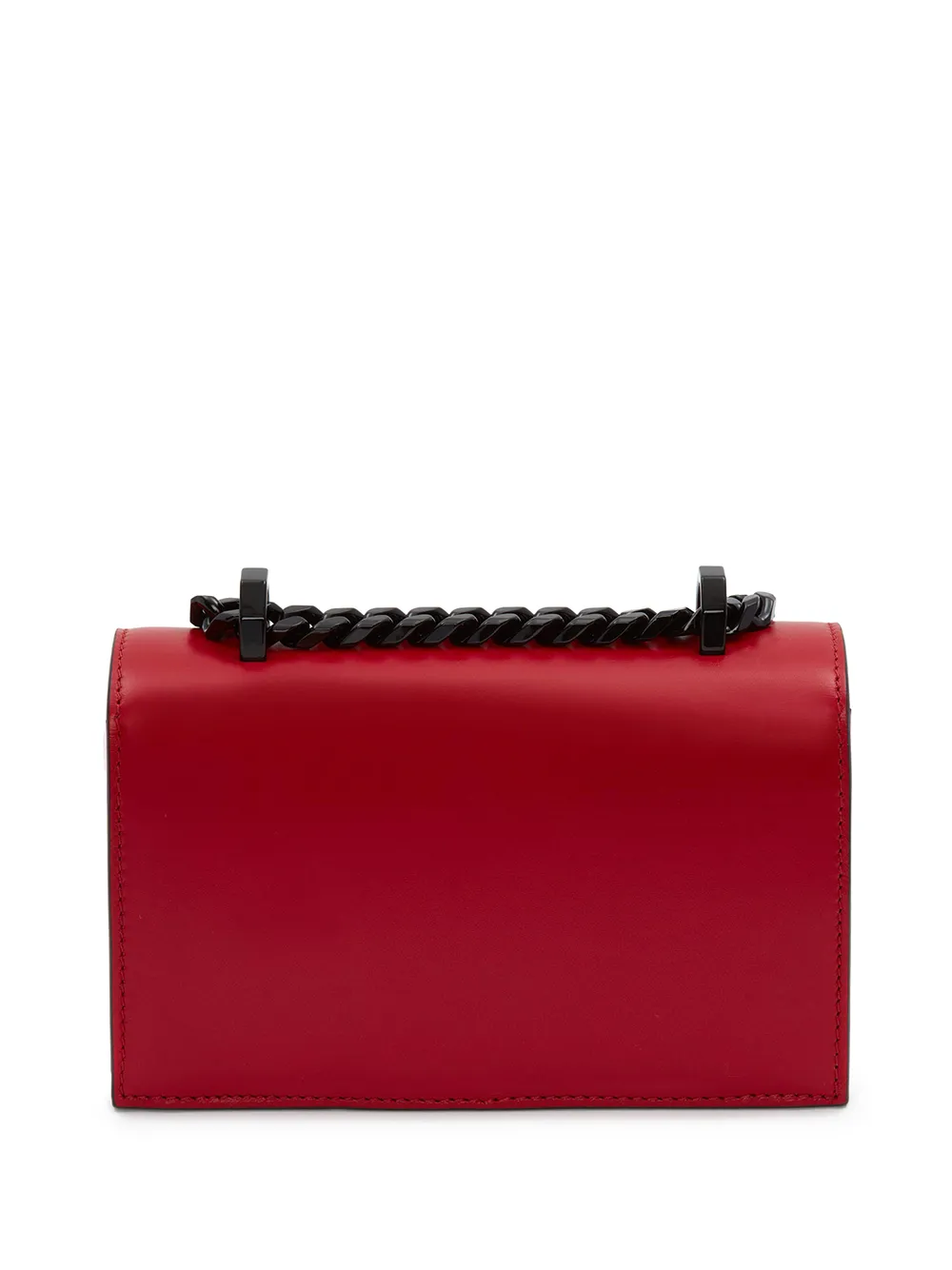 Caratteristico manico Four Ring, tracolla a catena, battente nella parte superiore con chiusura magnetica e tasca interna a soffietto. Materiale: pelle di vitello.