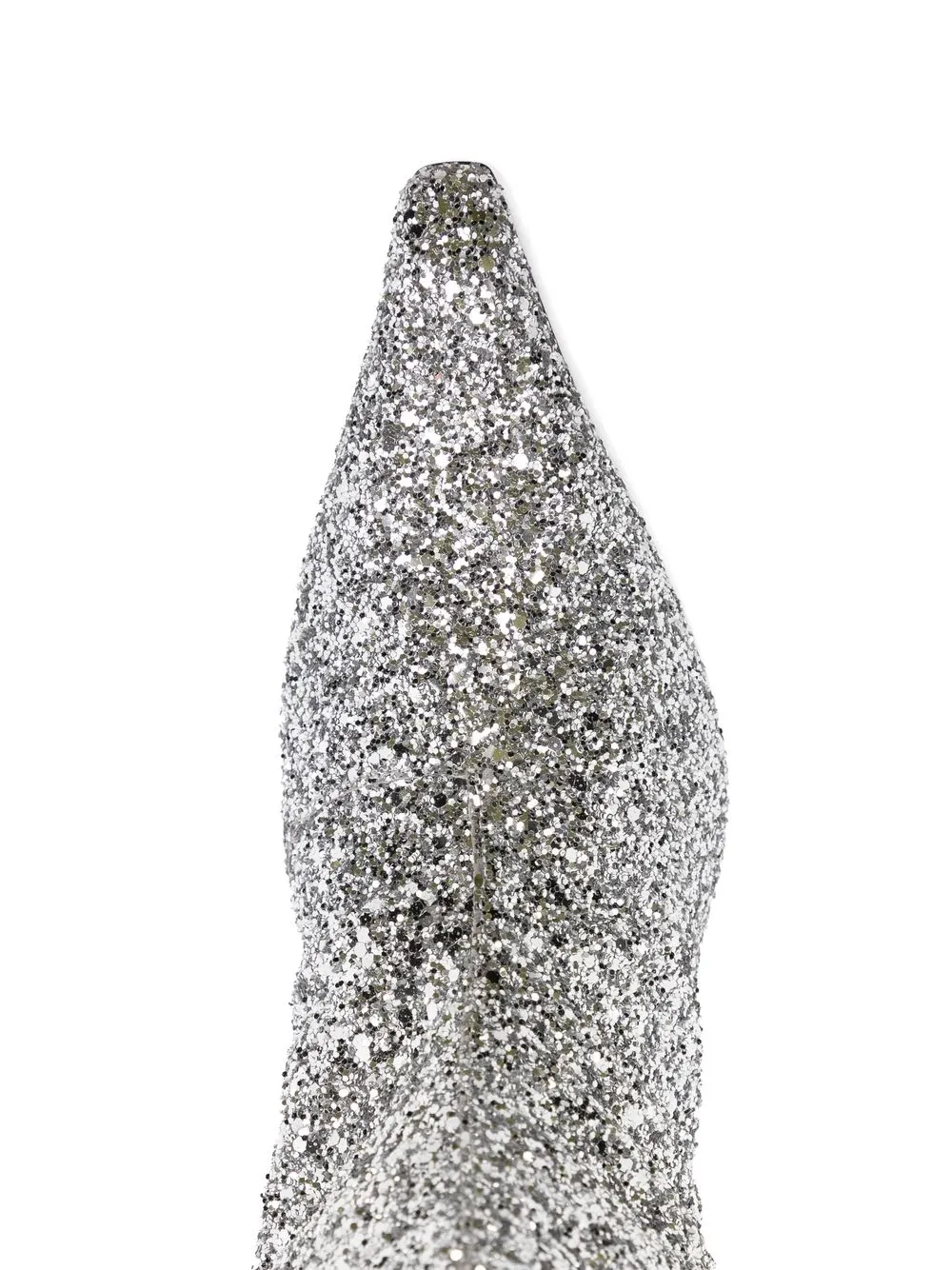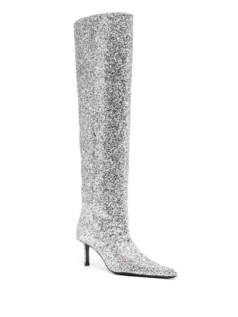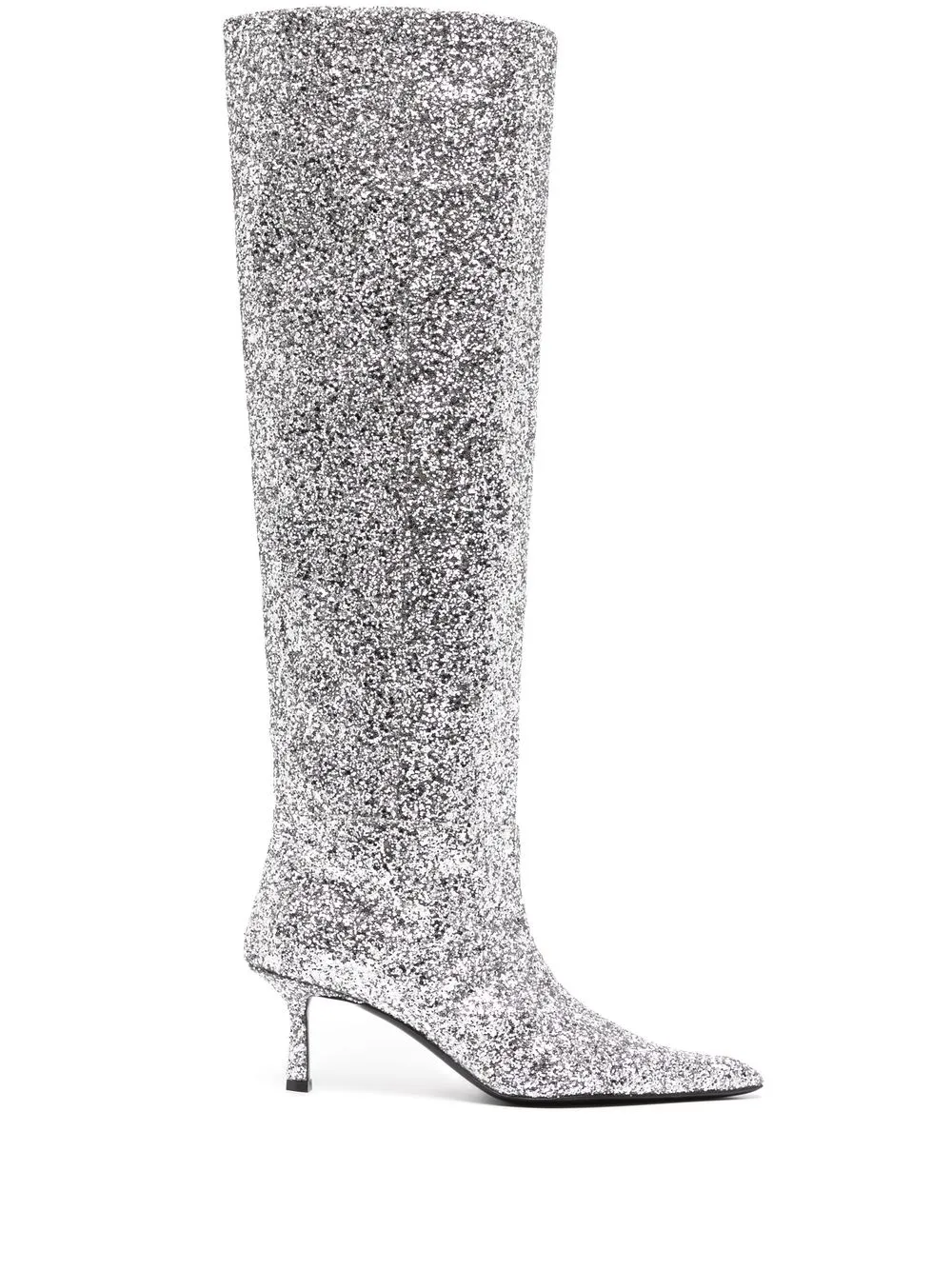 Color argento, cuoio, dettaglio con glitter, design a punta, altezza al ginocchio, tacco a cono medio e design pull on.