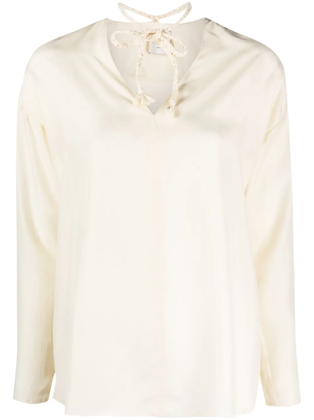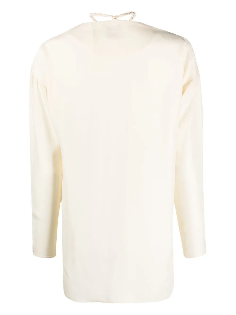 Tonalità bianco avorio, seta, dettaglio con corda, scollo a V, maniche con spalle scese, maniche lunghe, chiusura con nodo e orlo dritto.