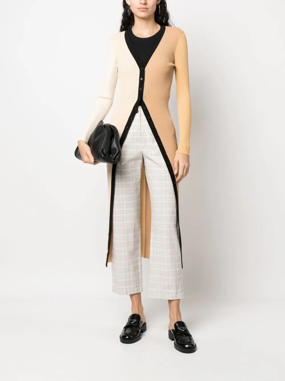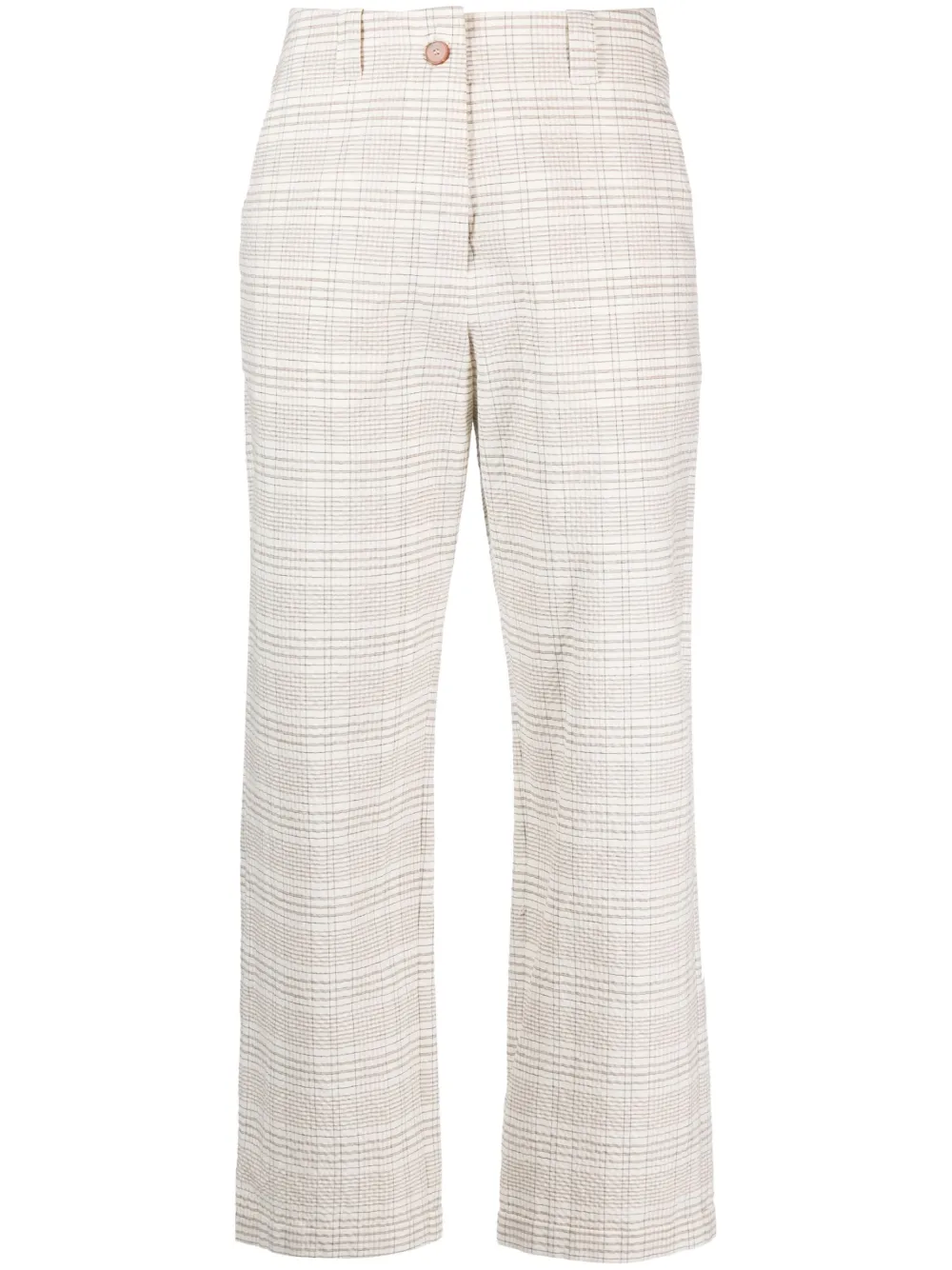 Alabastro, misto cotone, motivo a quadri, passanti, chiusura frontale con bottoni e zip, due tasche laterali a filetto, tasca posteriore nascosta con bottoni e taglio crop.