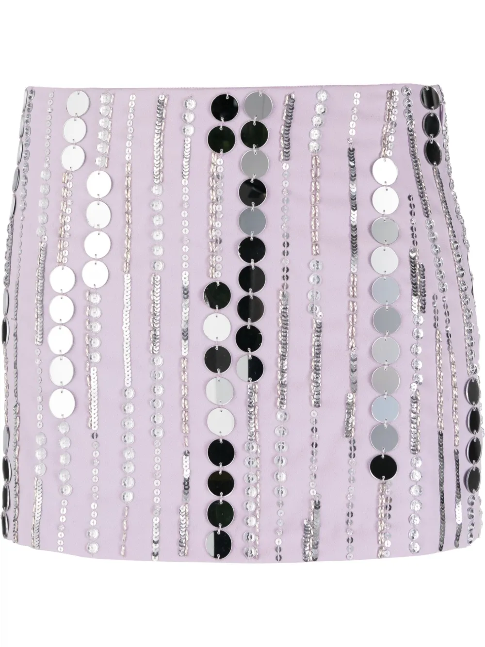 Lilla, decorazione con paillettes, vita media, chiusura laterale con zip nascosta e lunghezza sopra il ginocchio.