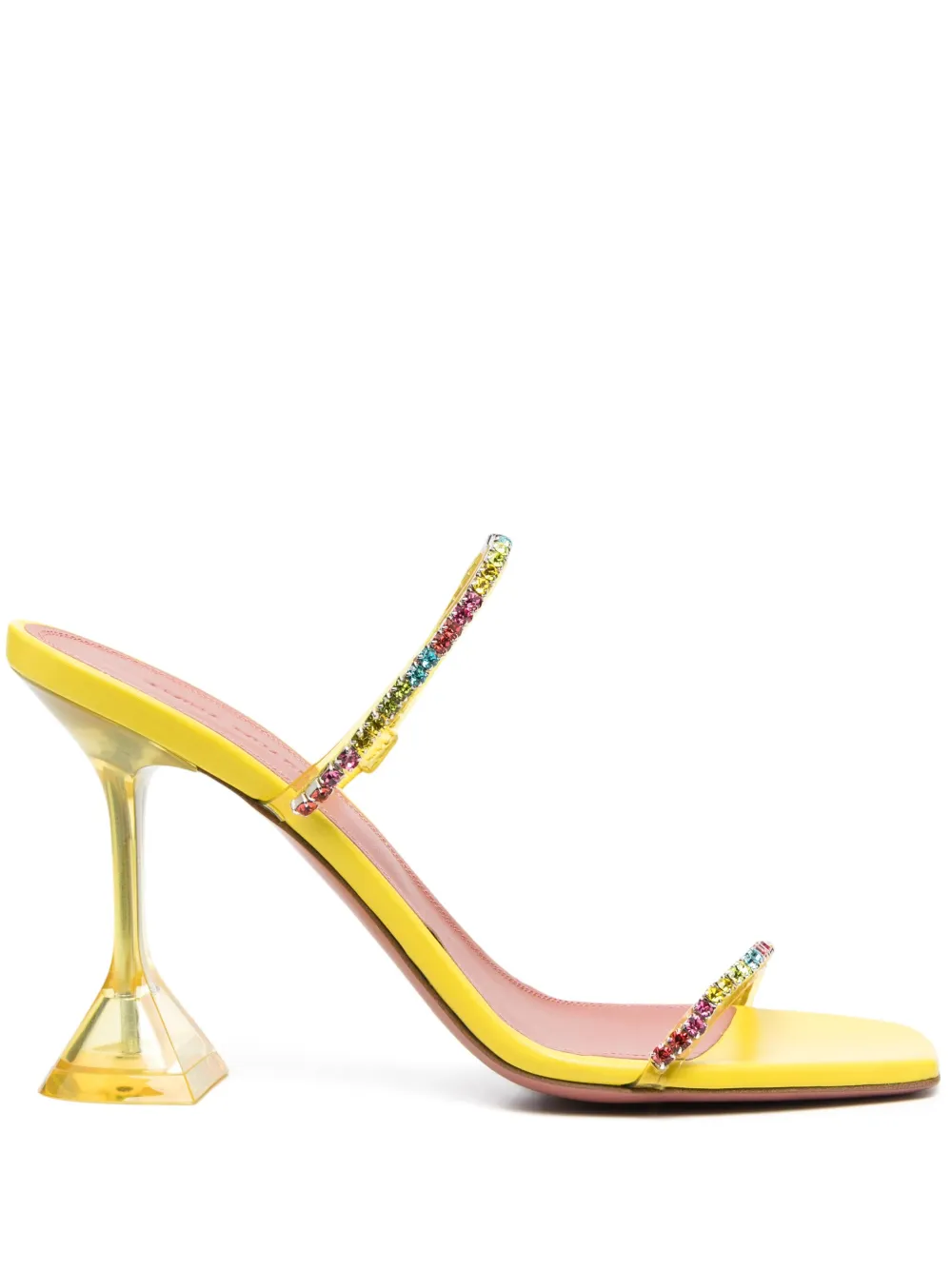 Giallo limone, pelle di vitello, punta squadrata aperta, decorazione in cristalli, soletta con logo e tacco alto scolpito.