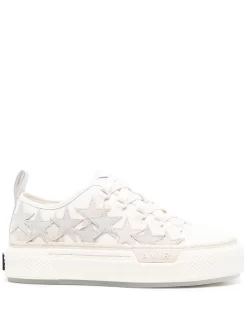 Pelle di vitello, dettaglio con applicazione a stella, logo laterale goffrato, punta in gomma, punta tonda, chiusura frontale con lacci e suola piatta in gomma.