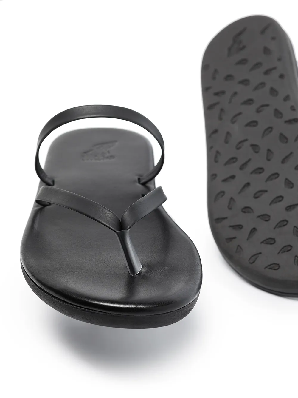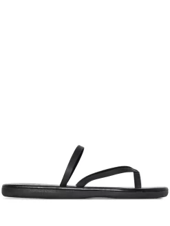 Sandali di colore nero in pelle di Ancient Greek Sandals. Modello con punta aperta, fascia sull’alluce, design senza lacci e suola piatta in gomma.