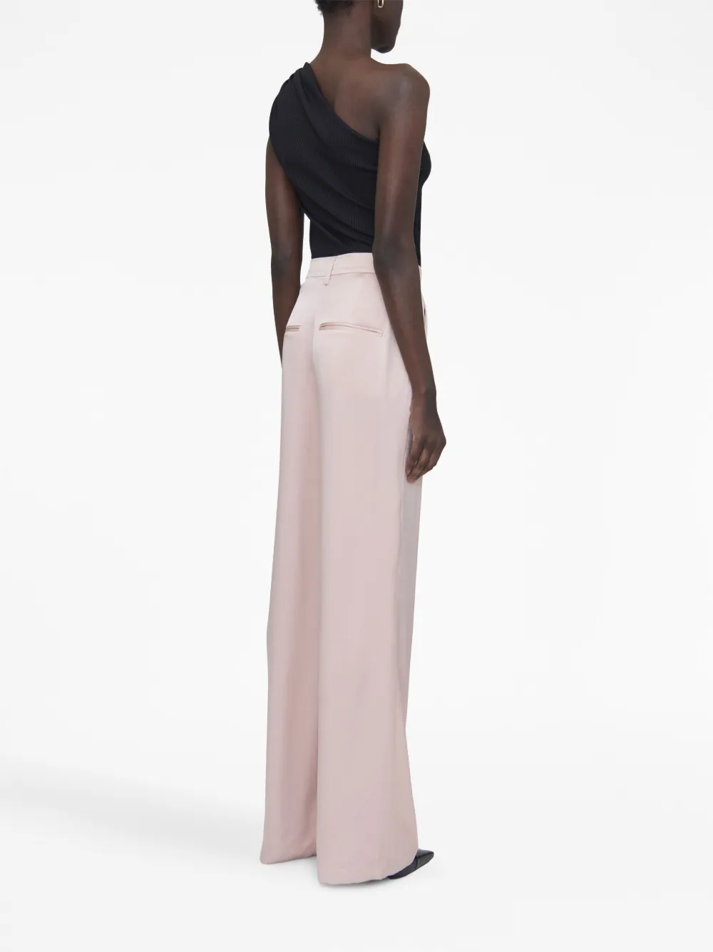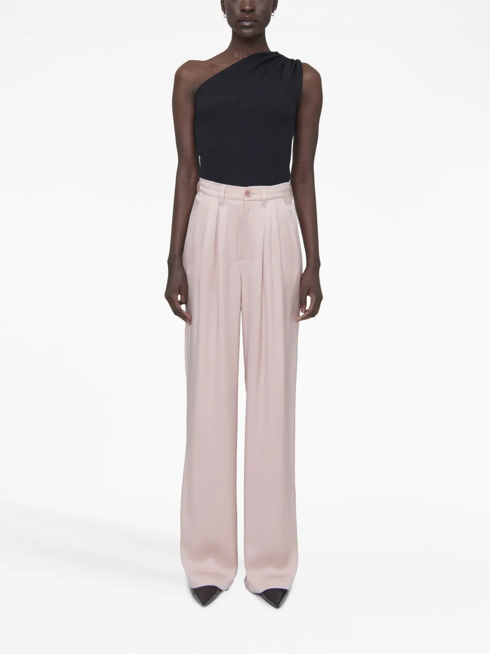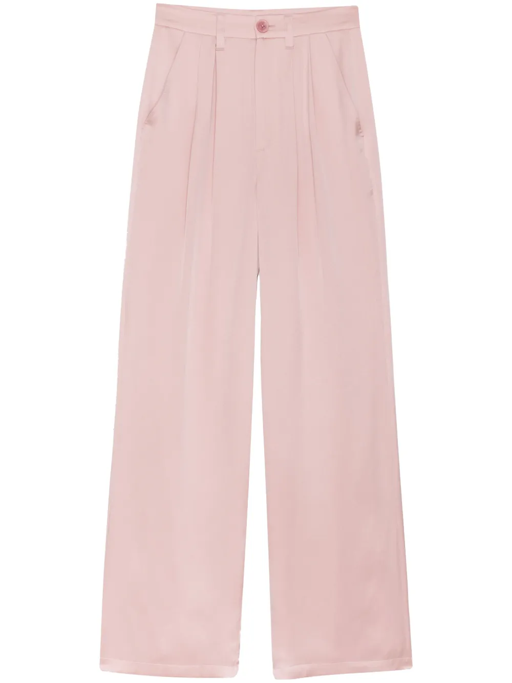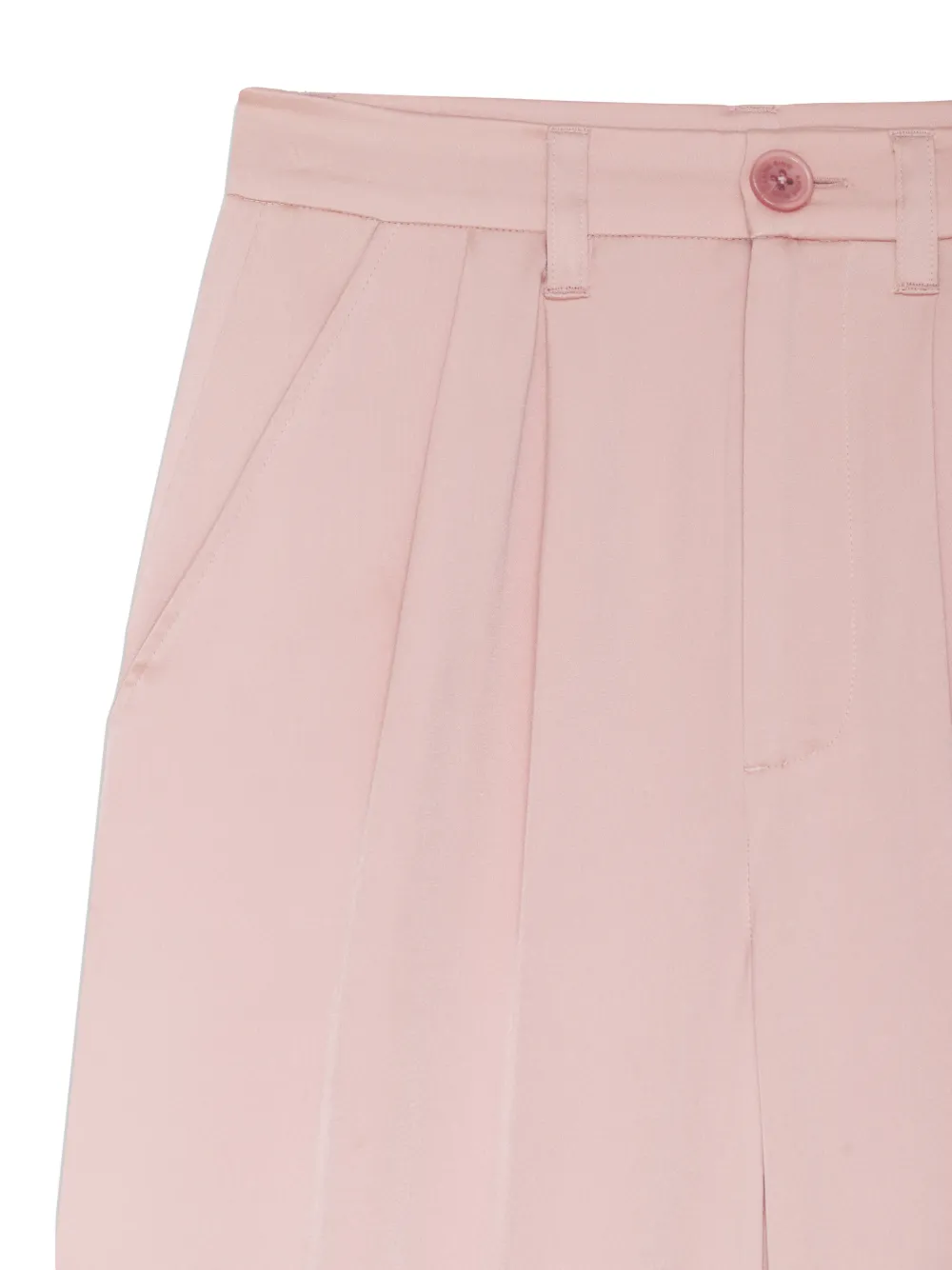 Rosa blush, seta, finitura satinata, dettaglio plissettato, passanti, vita alta, vestibilità gamba ampia, chiusura con bottoni, due tasche diagonali laterali e due tasche posteriori a filetto.