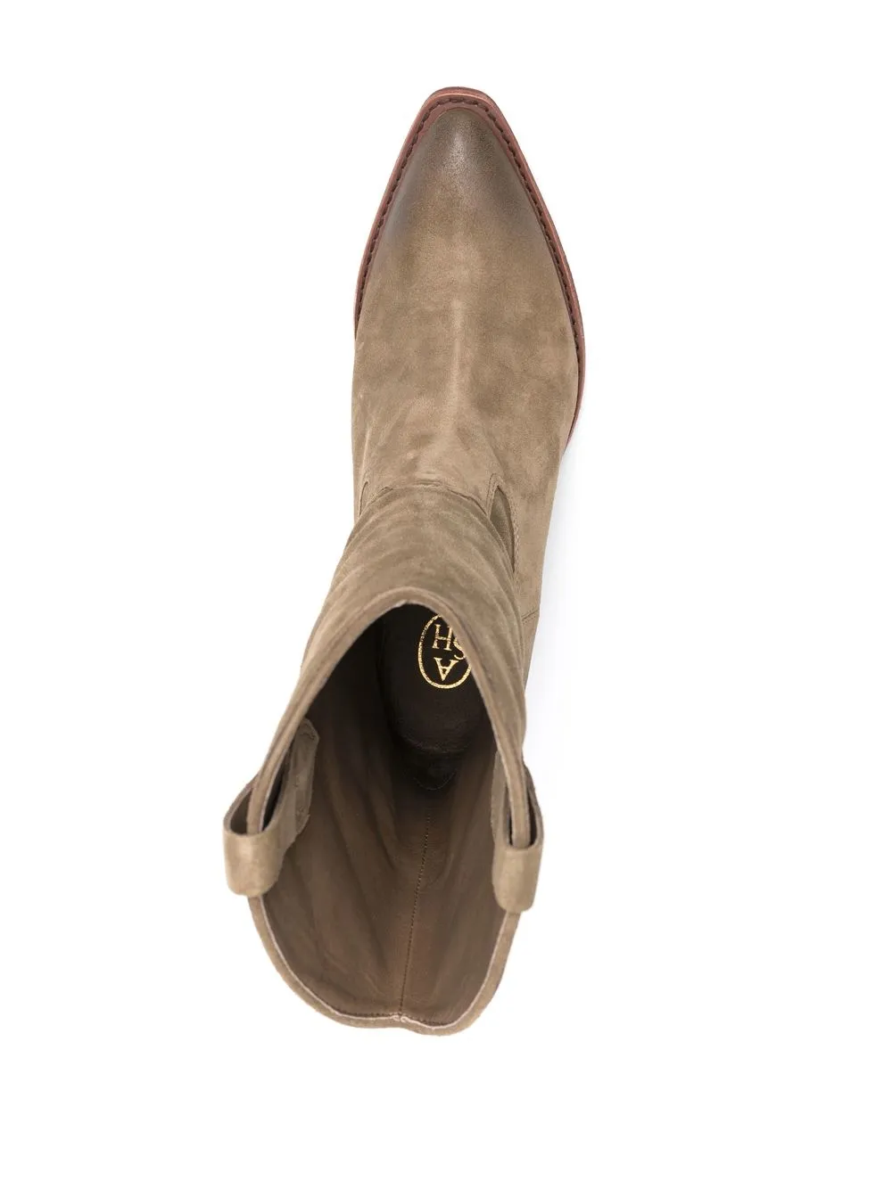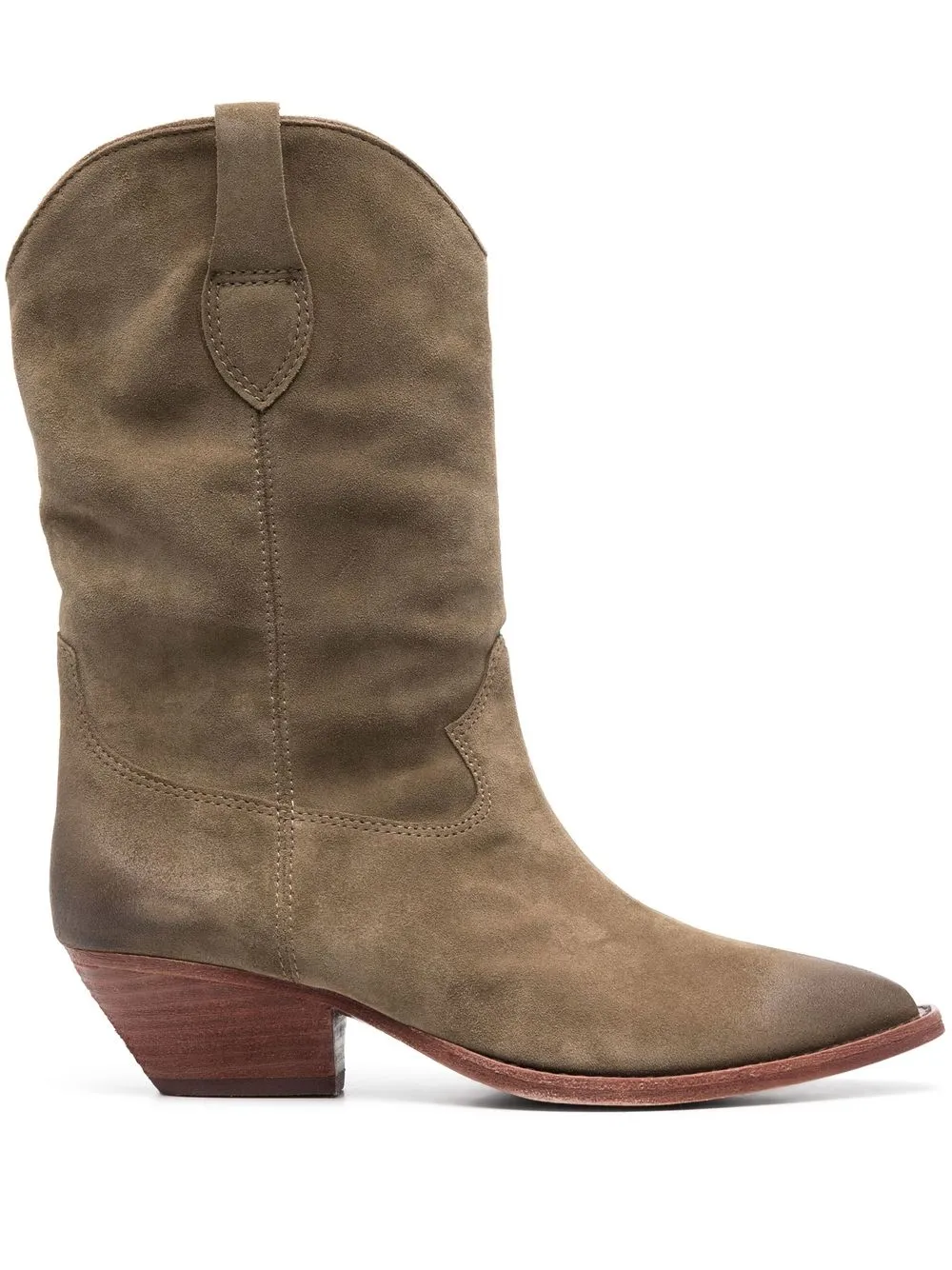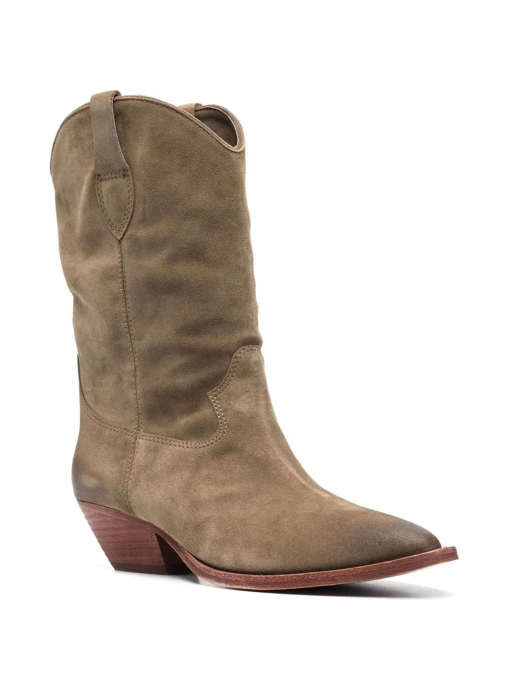 Sabbia, pelle di vitello, pelle scamosciata di vitello, chiusura con doppia linguetta, design a punta, design a punta, tacco largo medio e design pull on.