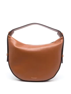 Cioccolato, pelle di vitello, dettagli color oro, chiusura superiore con zip, manico superiore e scomparto unico.