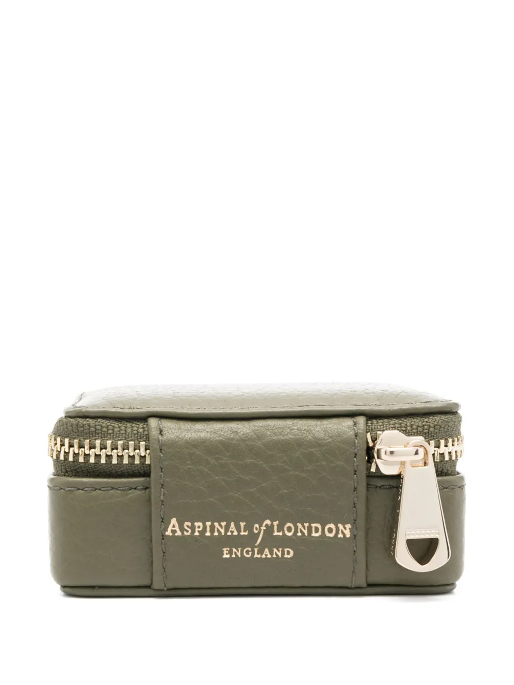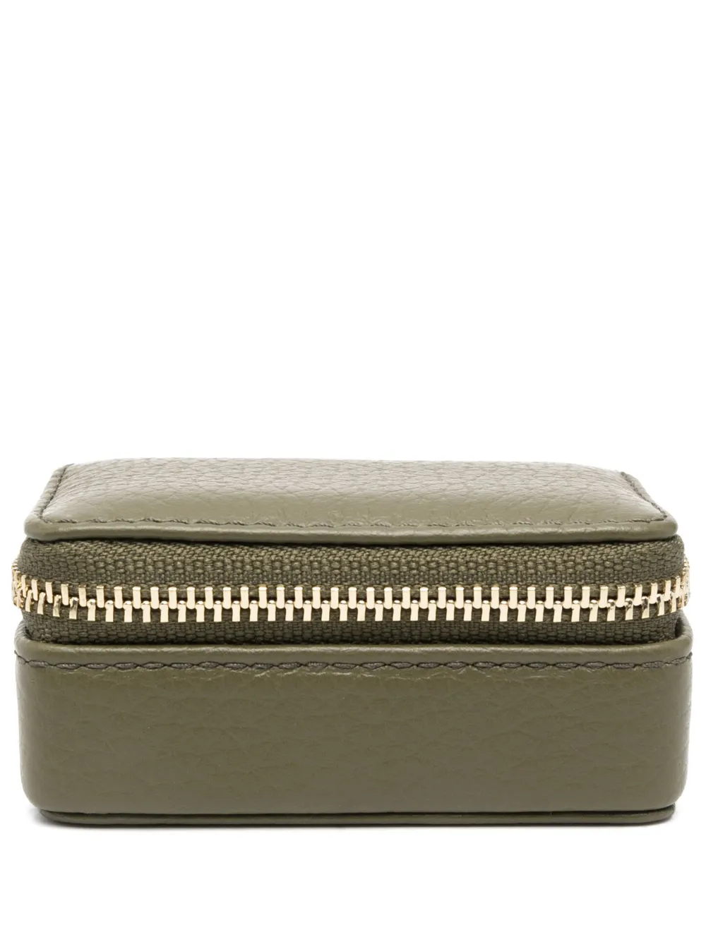 Verde felce, pelle di vitello, stampa con logo sul retro, chiusura con zip a giro e scomparto unico.