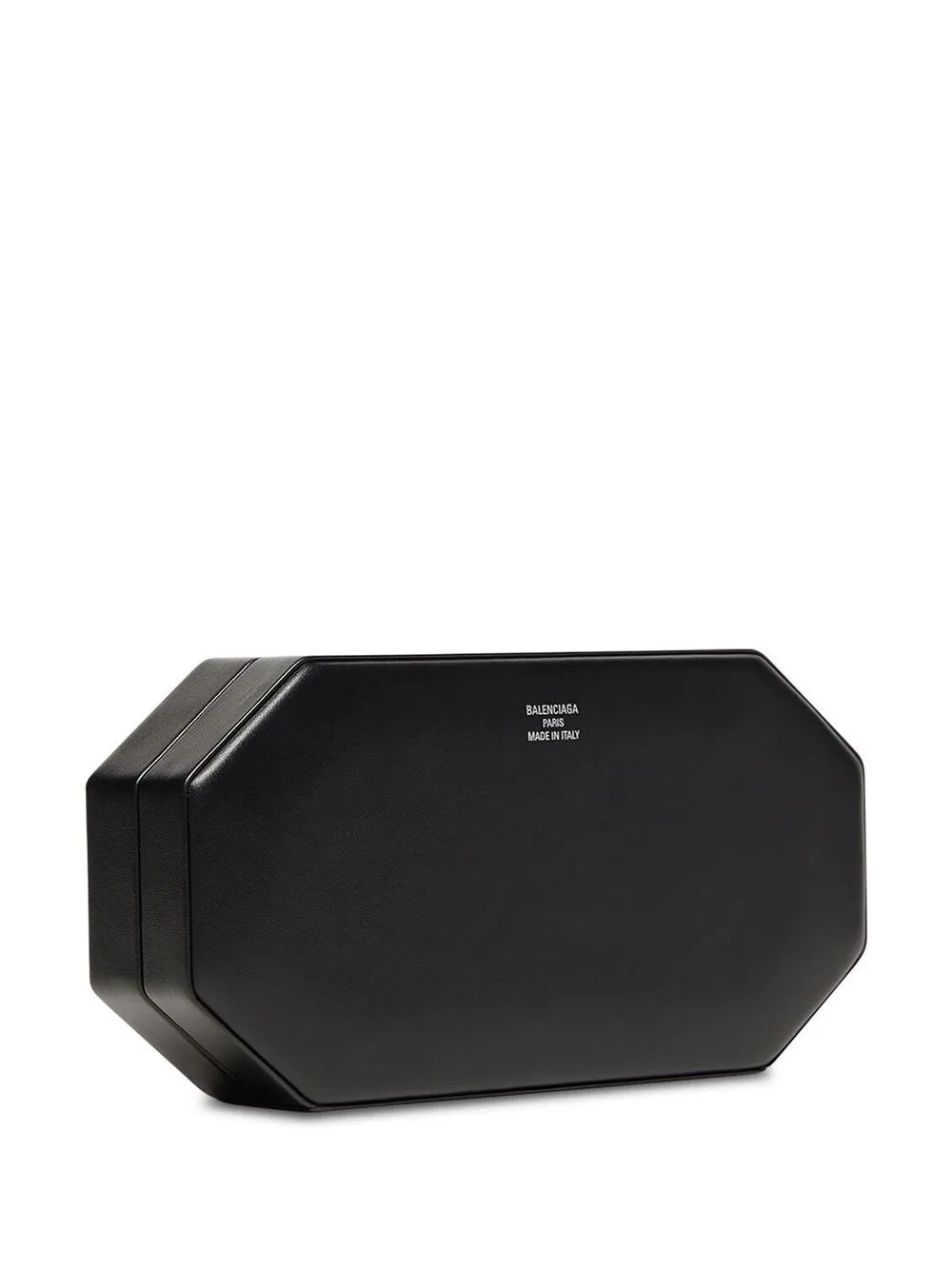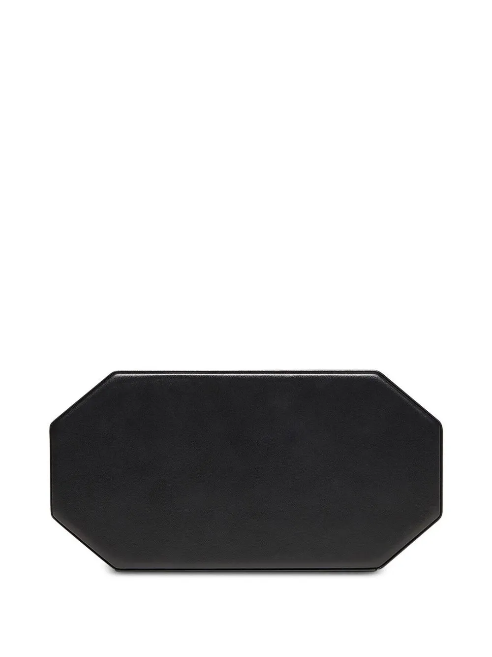Nero, pelle di vitello, stampa con logo frontale, chiusura magnetica nascosta, scomparto unico, tasca interna applicata e fodera in raso.
