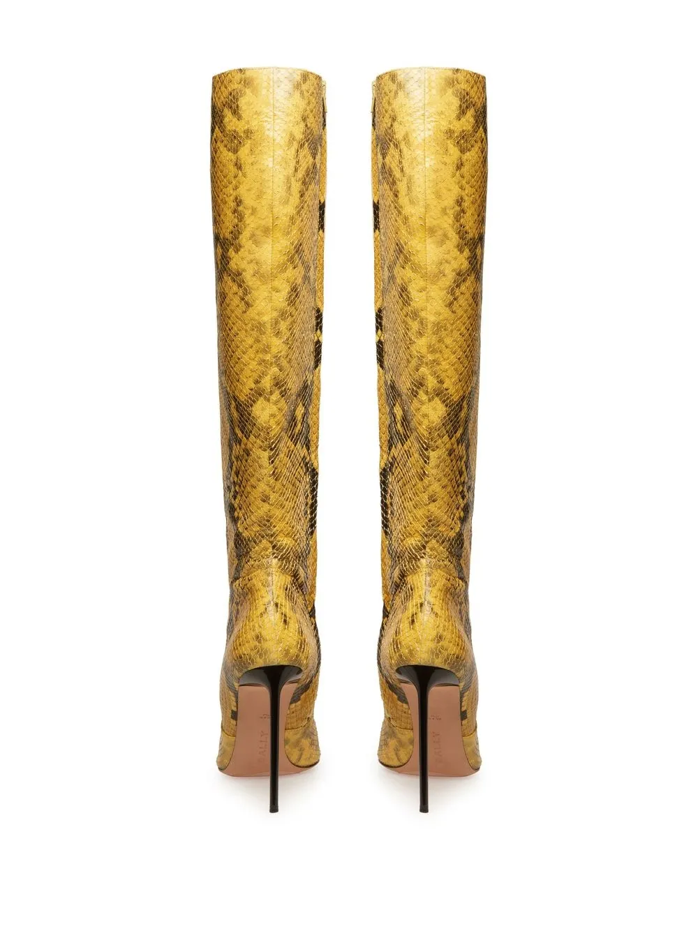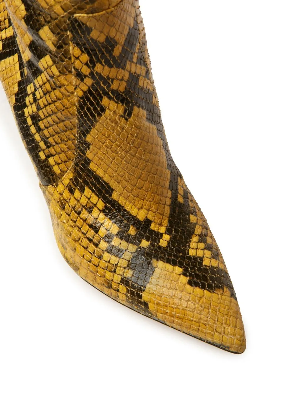 Giallo, cuoio, pelle di capra, stampa all over effetto pelle di serpente, cuciture tono su tono, design a punta, suola in pelle e tacco alto a stiletto.