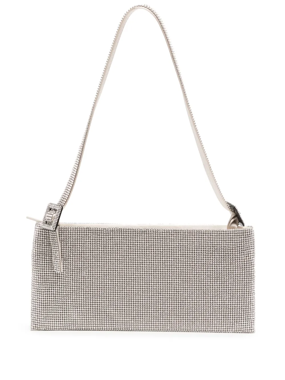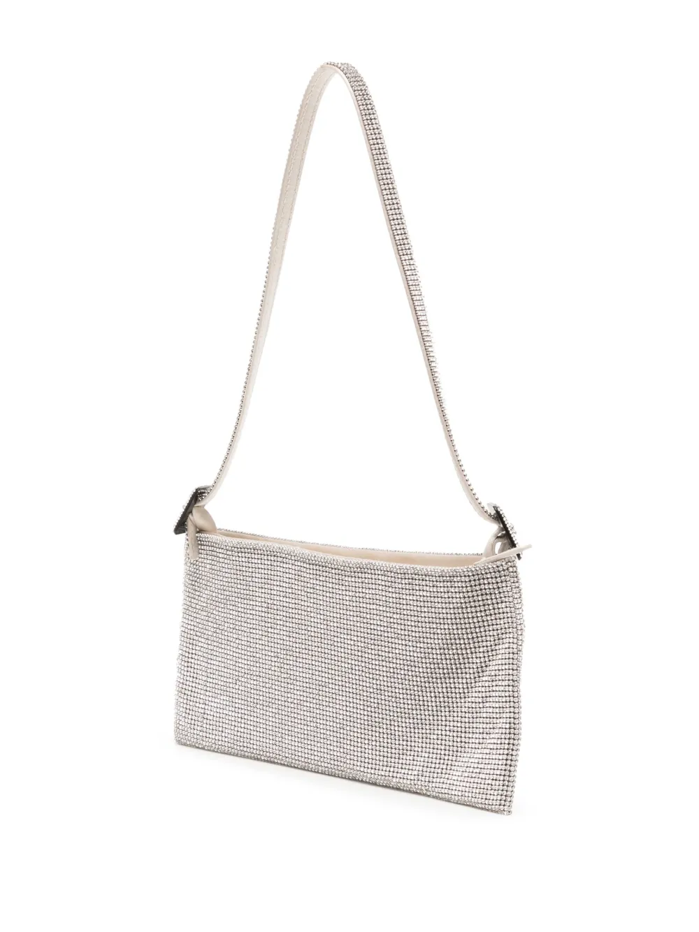 Color argento, decorazione con diamanti sintetici, chiusura superiore con zip, manico piatto e scomparto unico.
