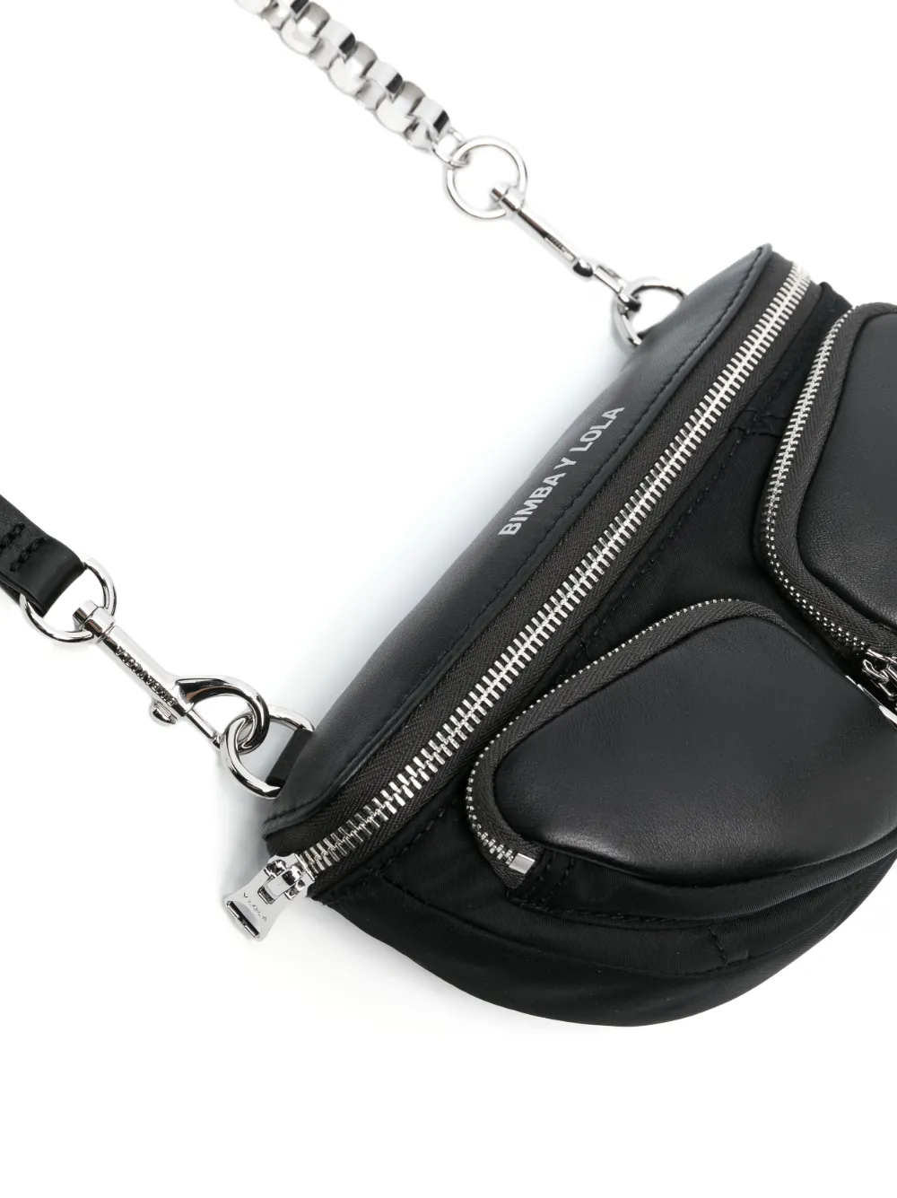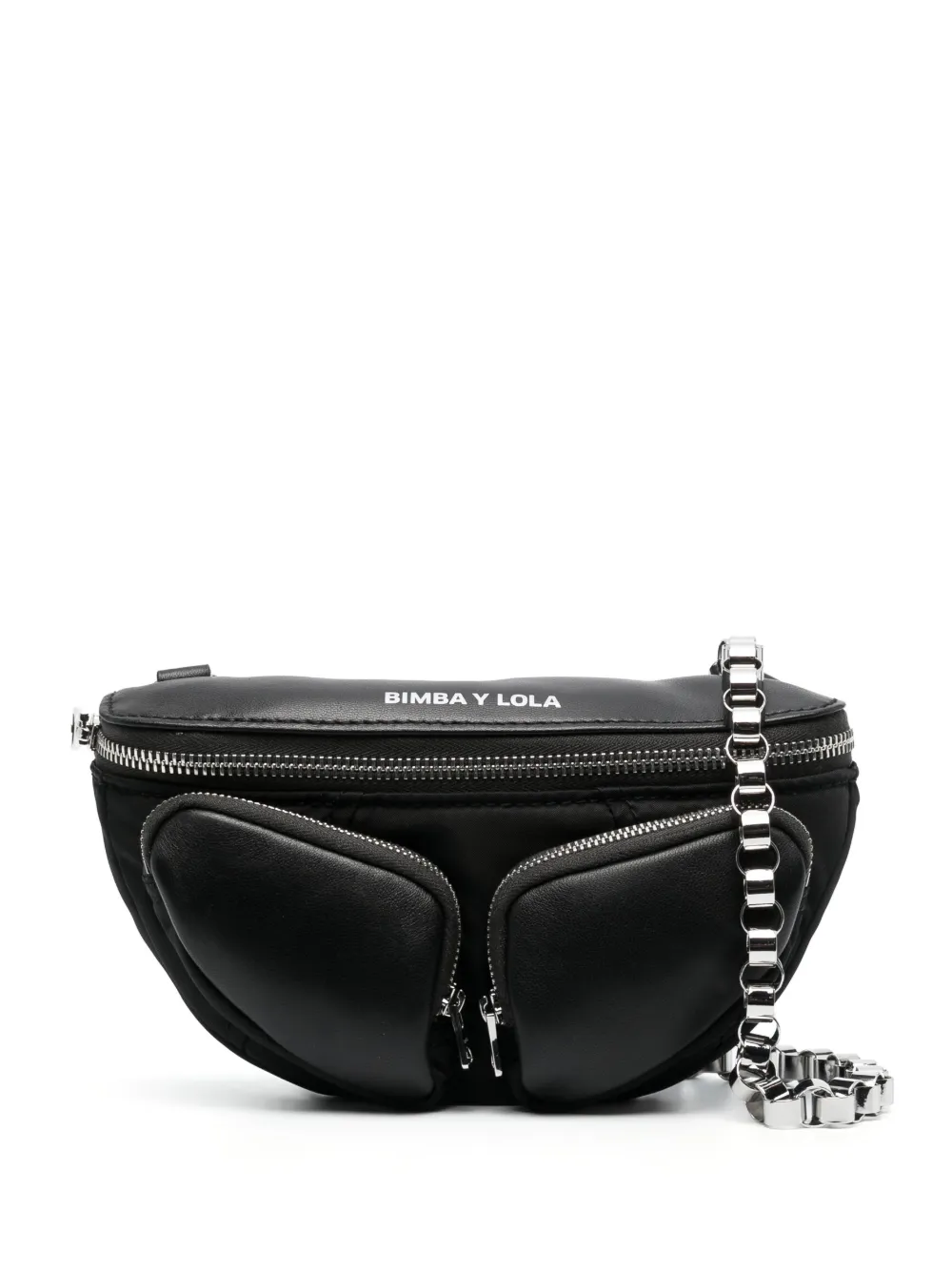 Nero, dettagli color argento, stampa con logo sul davanti, scomparto frontale con zip, chiusura superiore con zip, scomparto unico e tracolla rimovibile con catena.