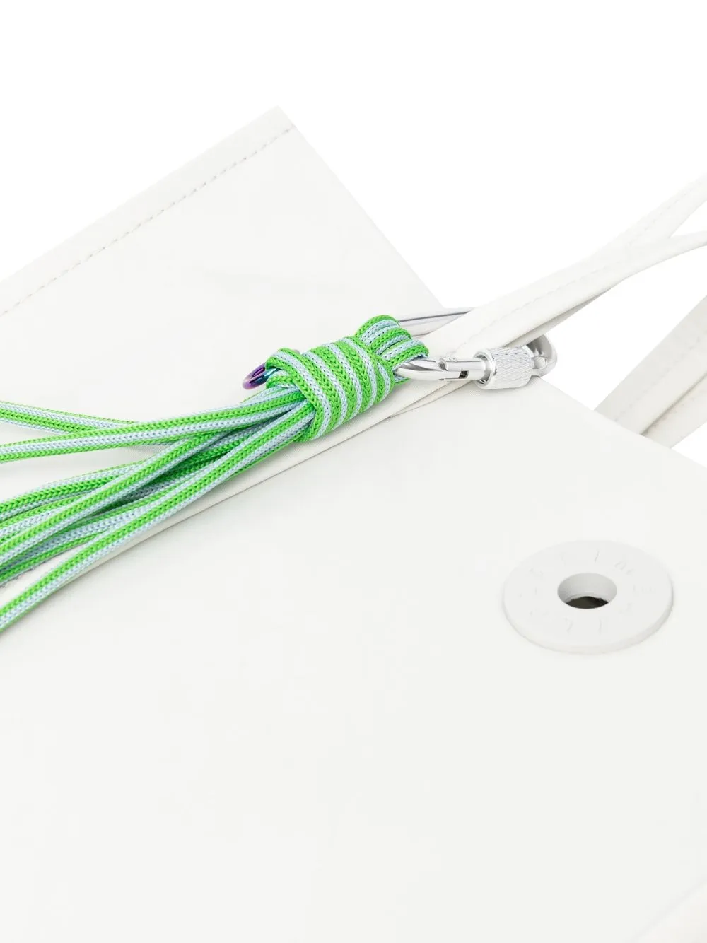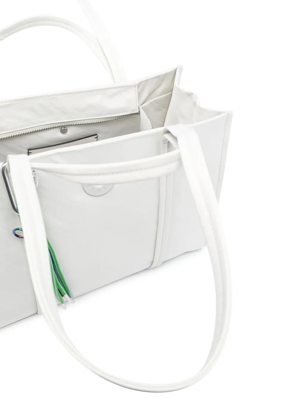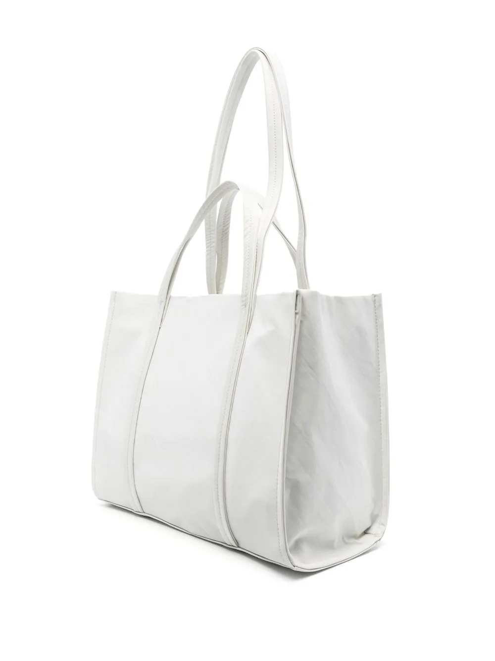Grigio chiaro, placca con logo tono su tono, due manici, gancio portachiavi, scomparto unico, chiusura superiore con zip, tasca interna a soffietto e applicazione interna con logo.