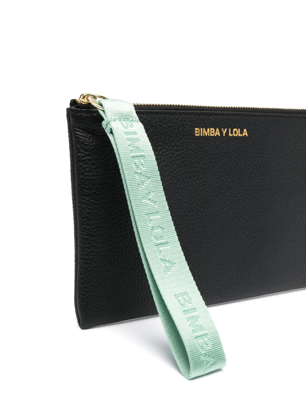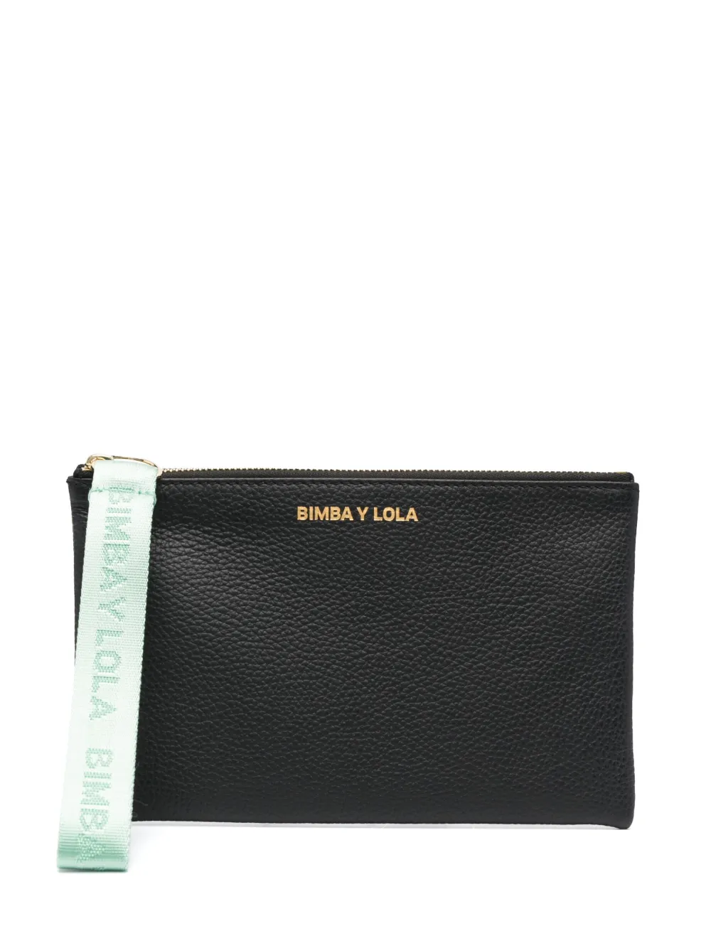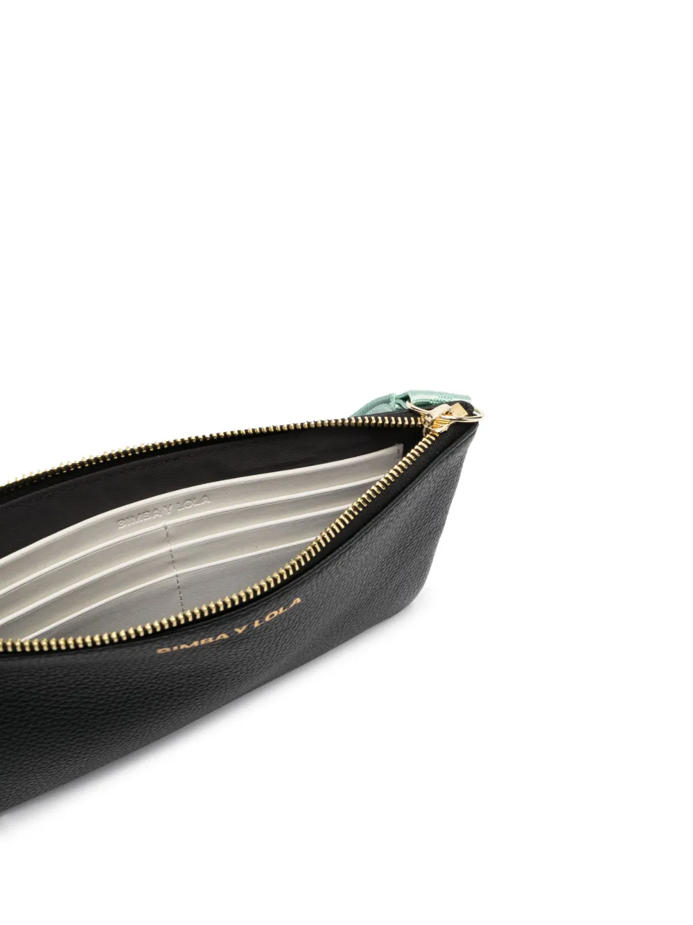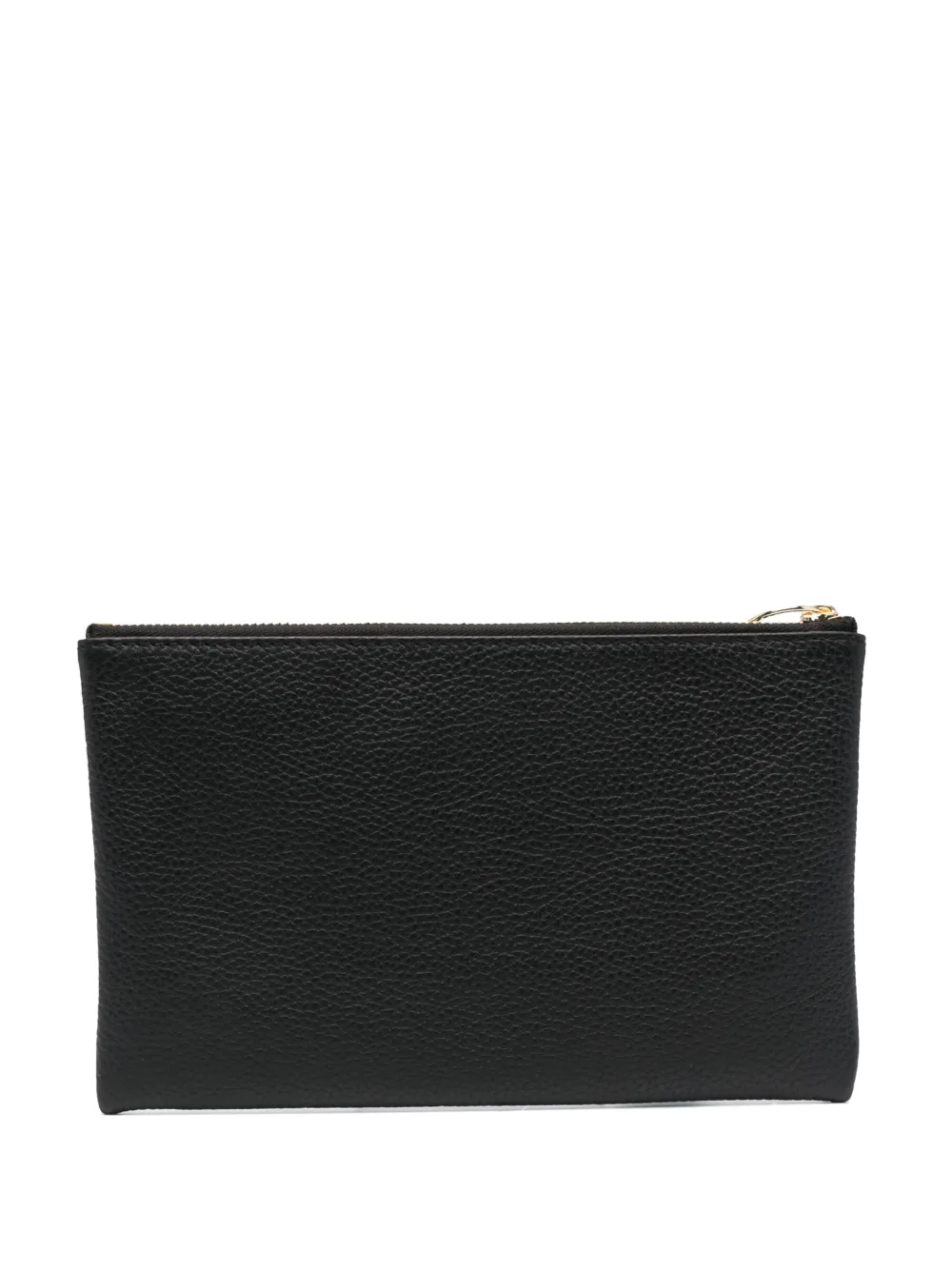 Nero, pelle, logo in lettere color oro, targhetta con logo, chiusura superiore con zip, fessure portacarte interne e scomparto unico.