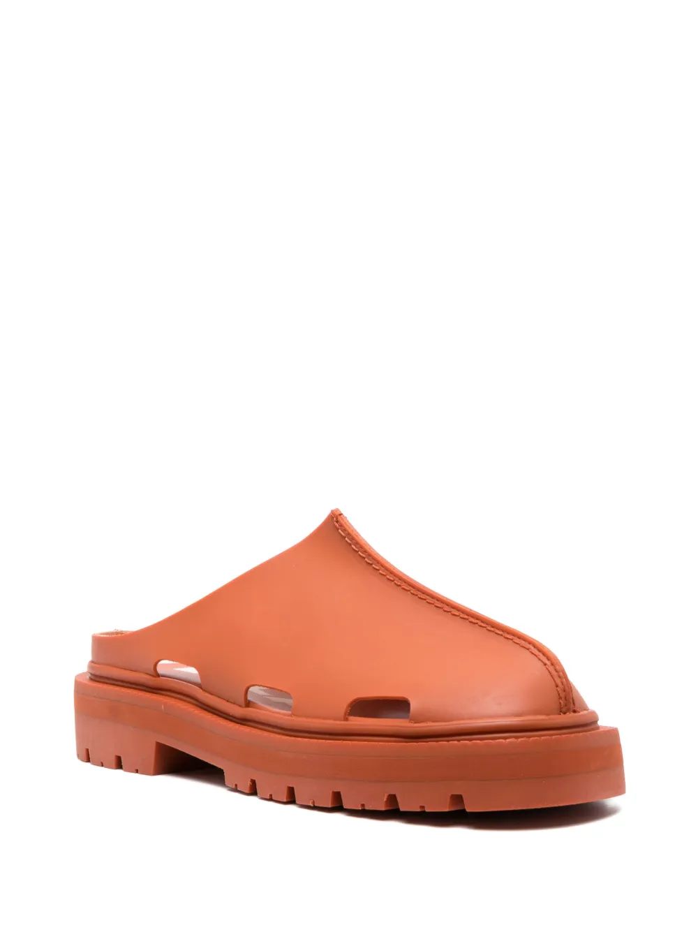 Arancione bruciato, dettaglio cut-out, dettaglio con cuciture, punta tonda, apertura sul retro, design slip-on, soletta in pelle con logo e suola chunky in gomma.