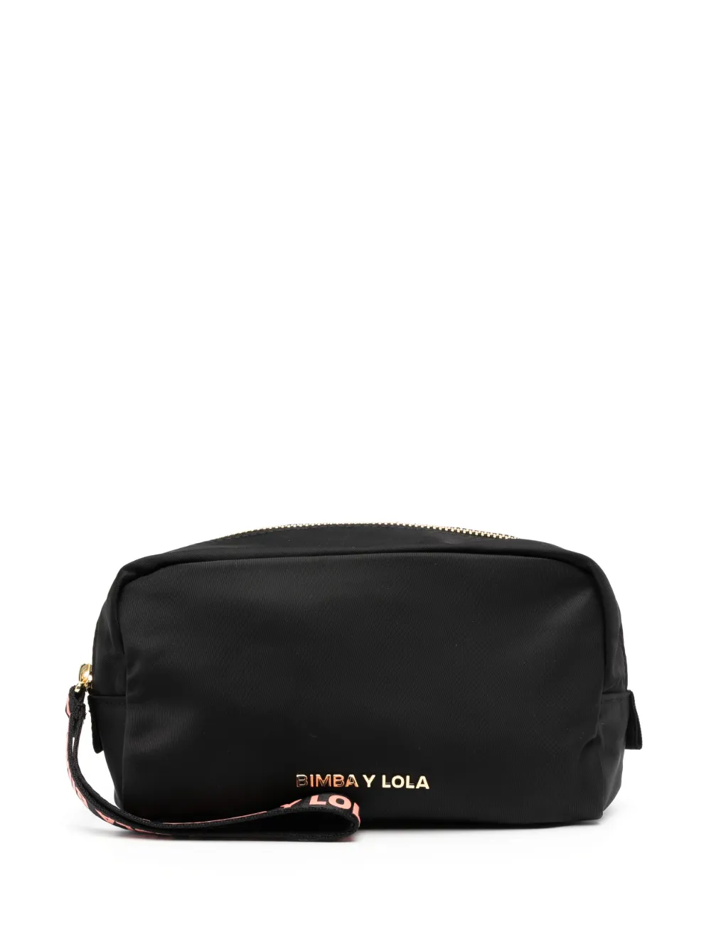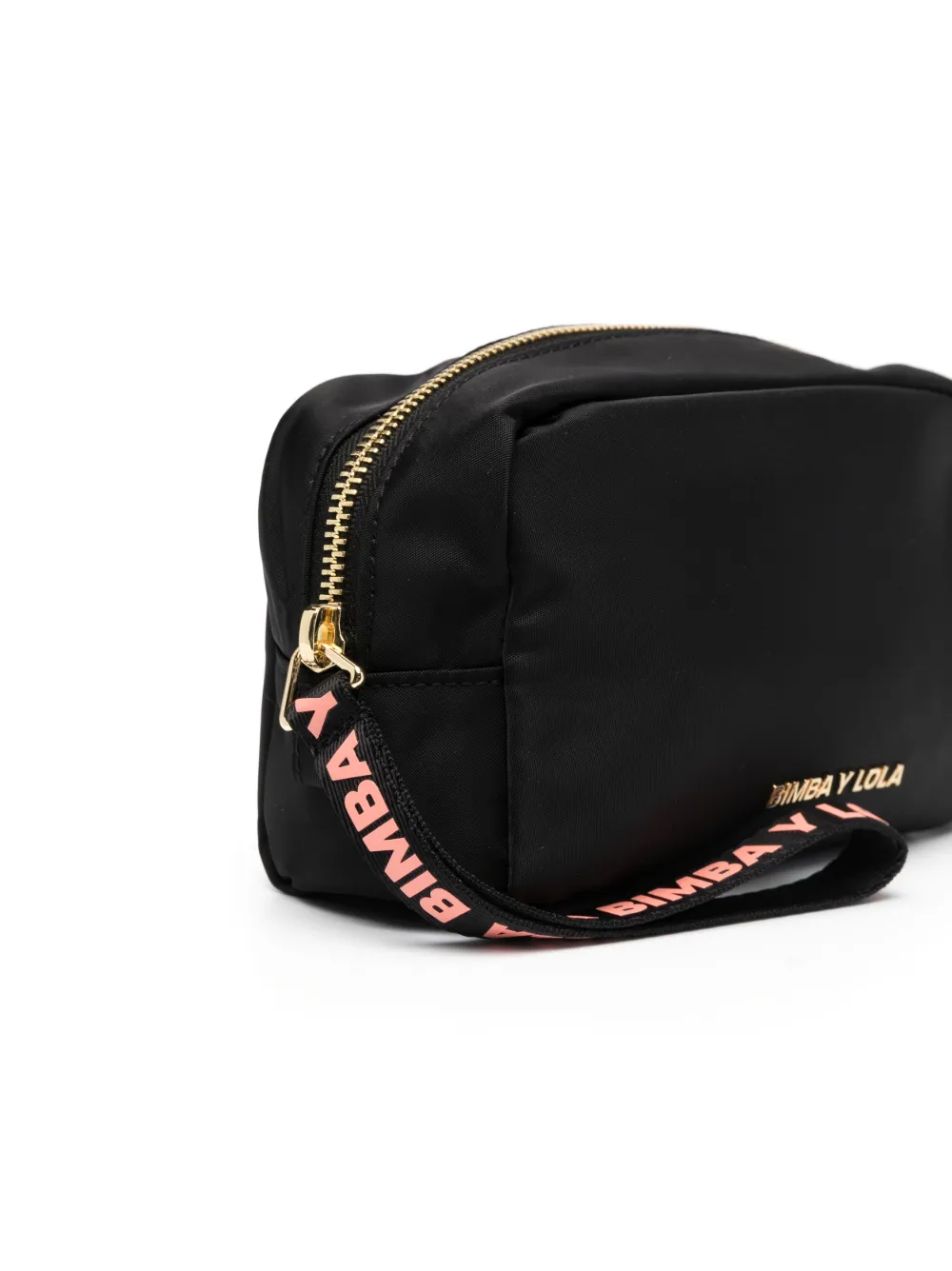 Nero, logo in lettere color oro, design rettangolare, scomparto unico, chiusura superiore con zip e applicazione interna con logo.
