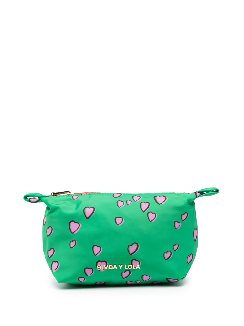Verde, motivo a cuori, logo in lettere color oro, applicazione interna con logo, chiusura superiore con zip e scomparto unico.