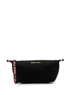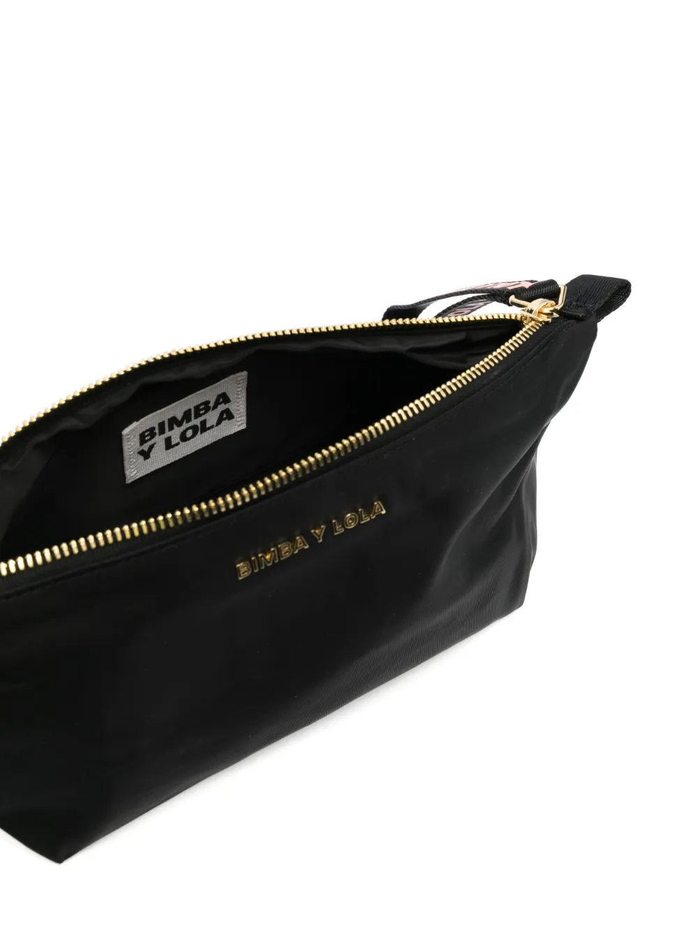 Nero, placca con logo color oro, fascia con logo stampato, applicazione interna con logo, chiusura superiore con zip, cinturino da polso e scomparto unico.