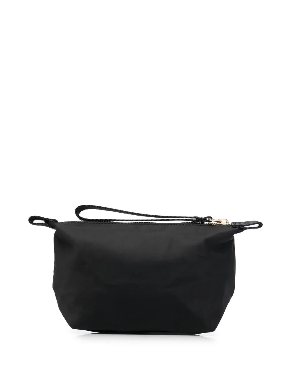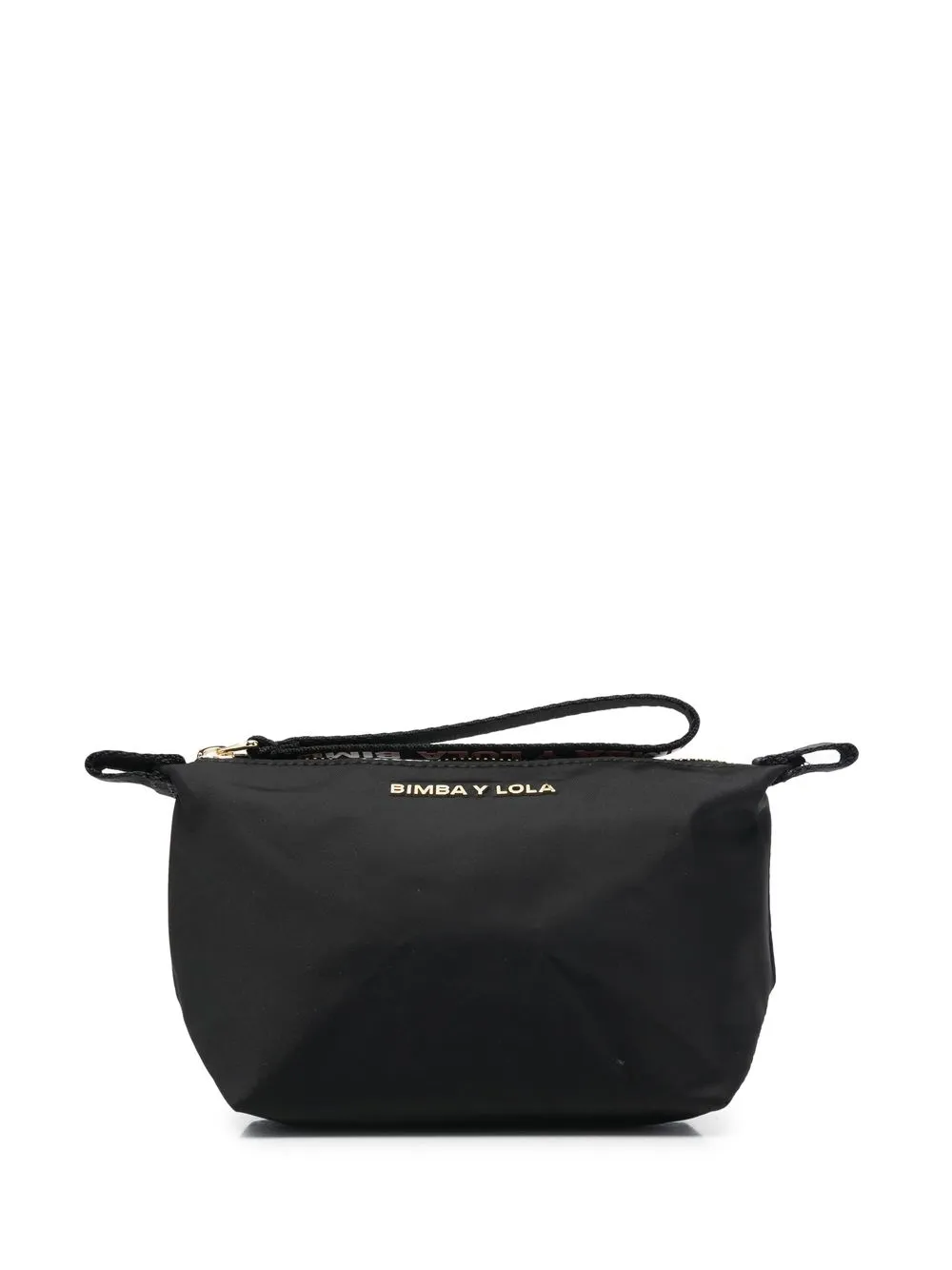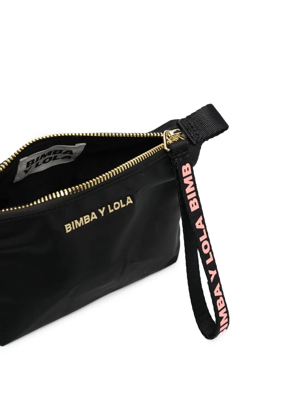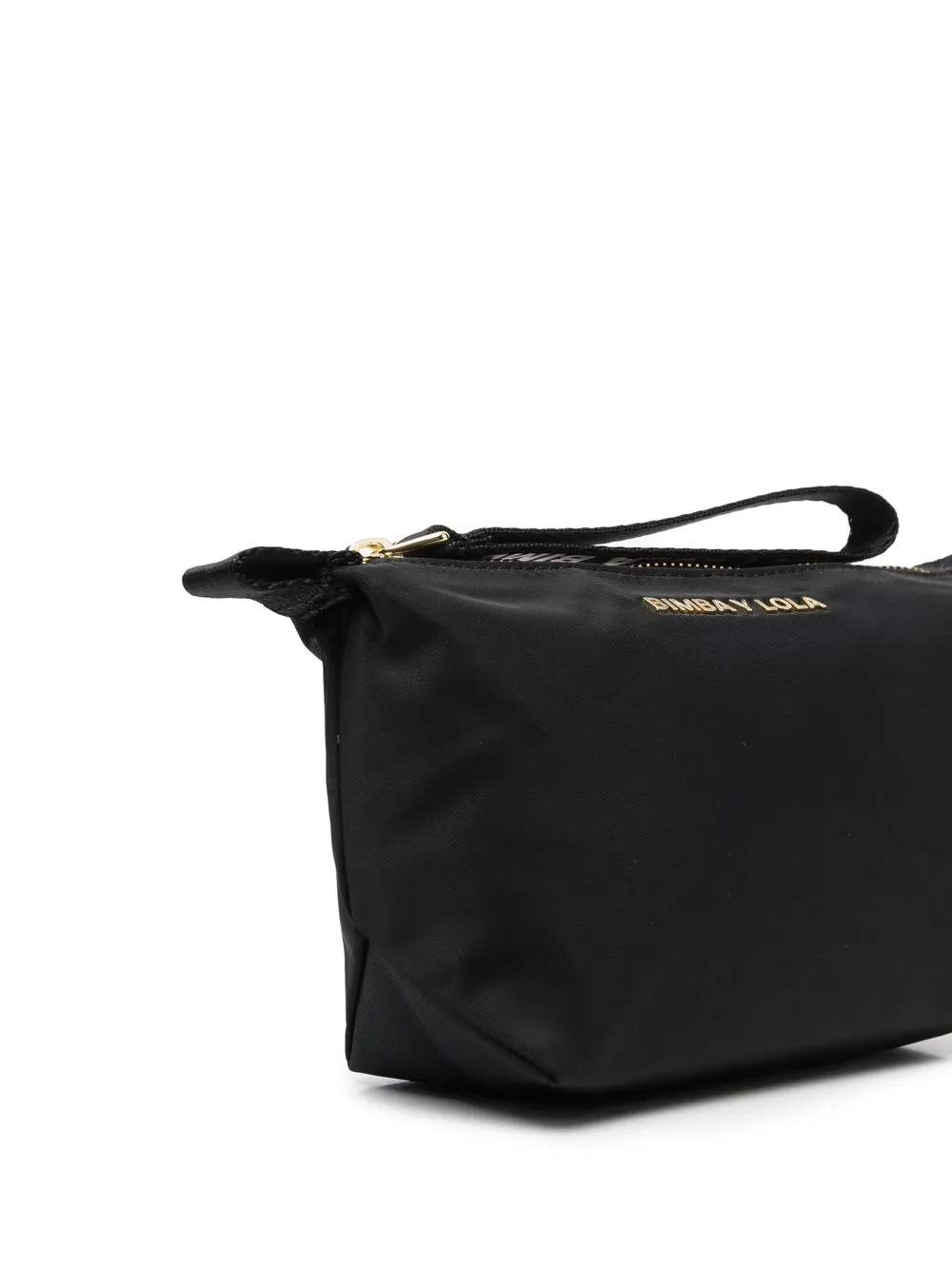 Nero, scritta con logo, chiusura superiore con zip, fascia con logo stampato, manico piatto laterale e scomparto unico.