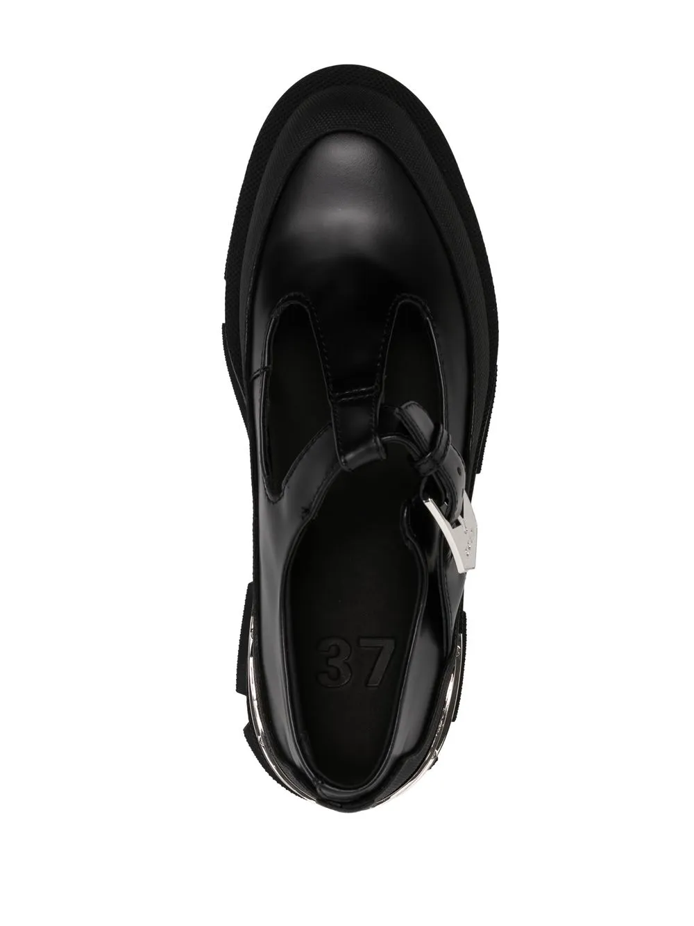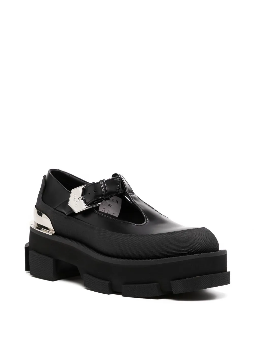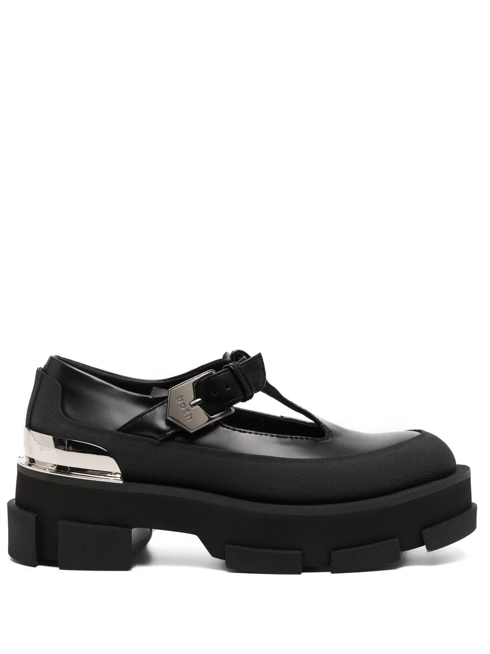 Chiusura laterale con fibbia, soletta con logo e suola in gomma antiscivolo.