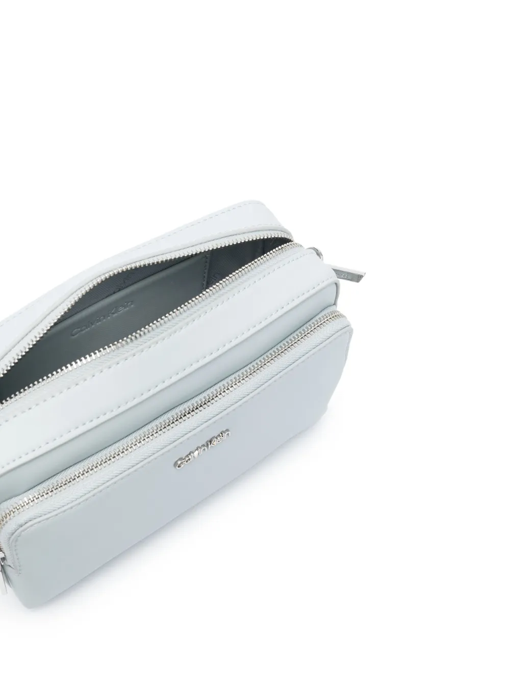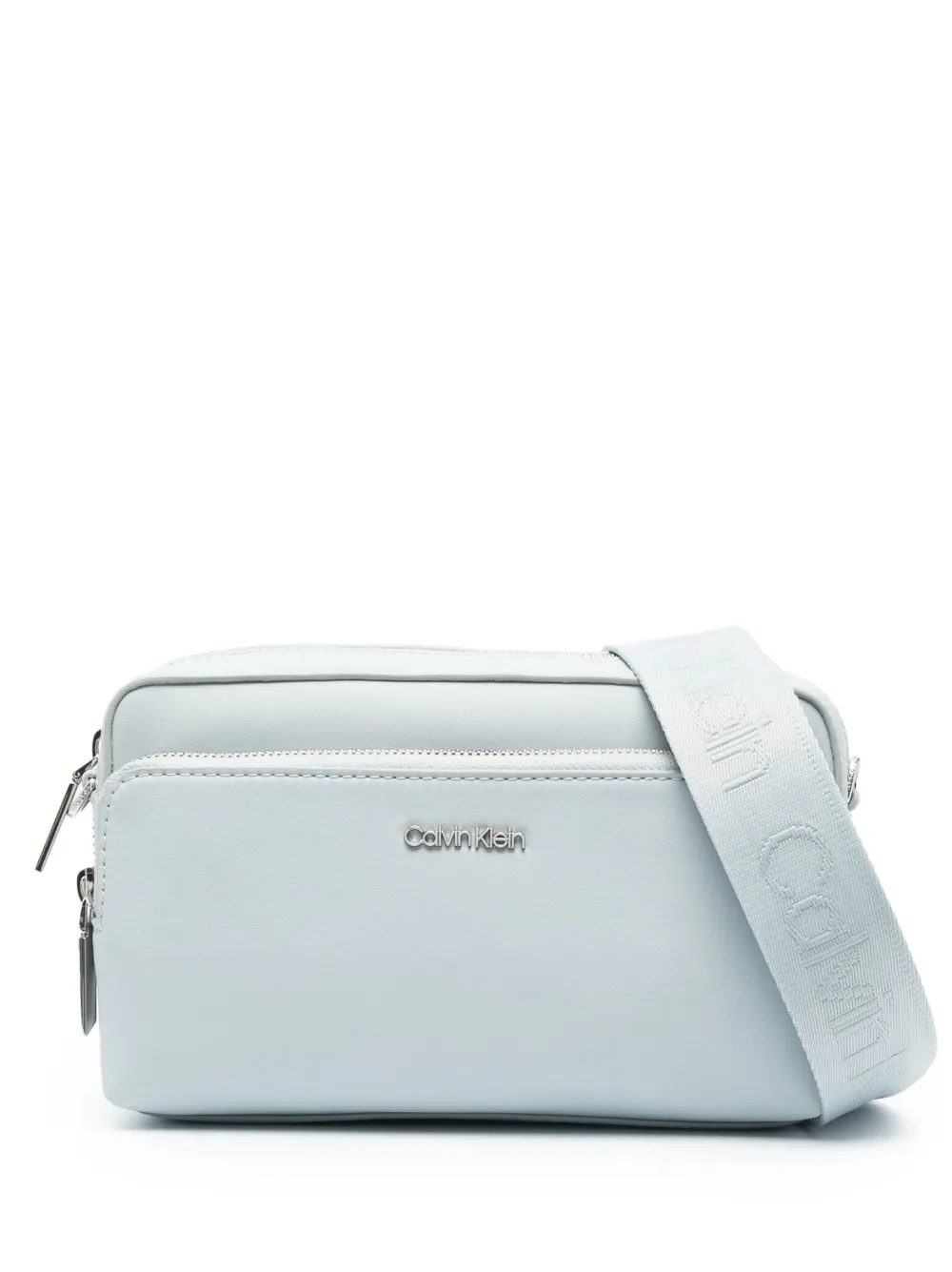 Blu polvere, dettagli color argento, placca con logo color argento, scomparto frontale con zip, chiusura superiore con zip, tracolla regolabile e rimovibile e scomparto unico.
