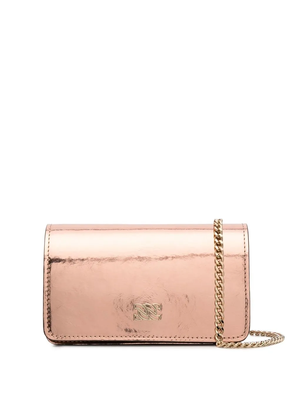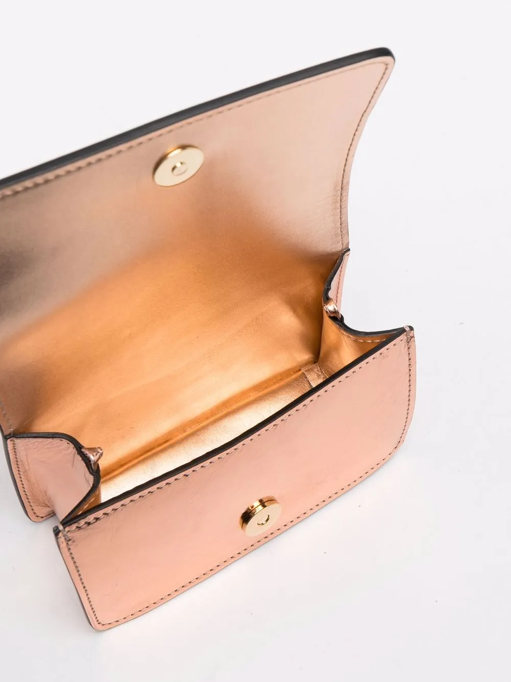 Effetto metallizzato, dettagli color oro, placca con logo color oro, battente nella parte superiore con chiusura magnetica, scomparto unico e tracolla a catena.