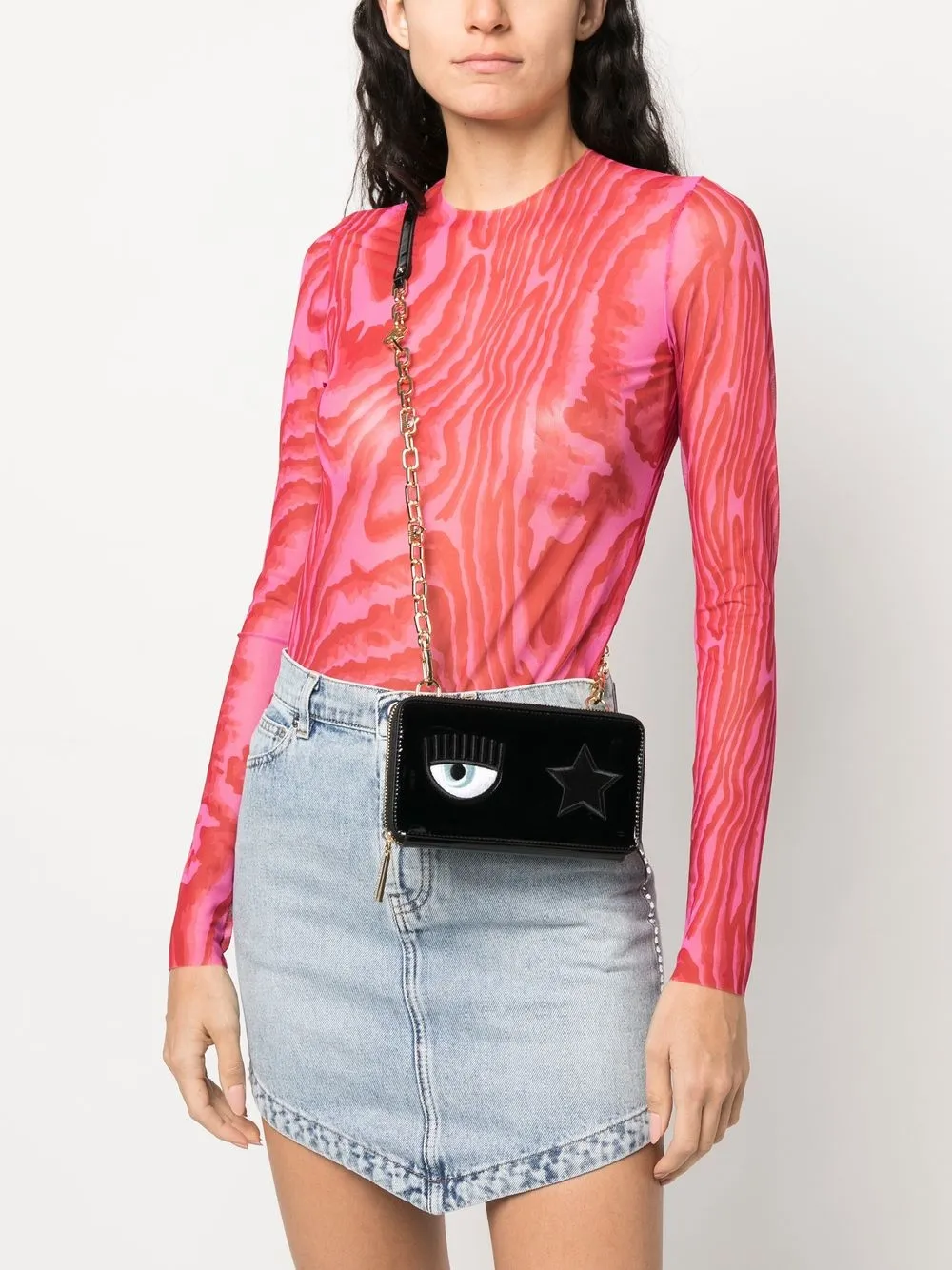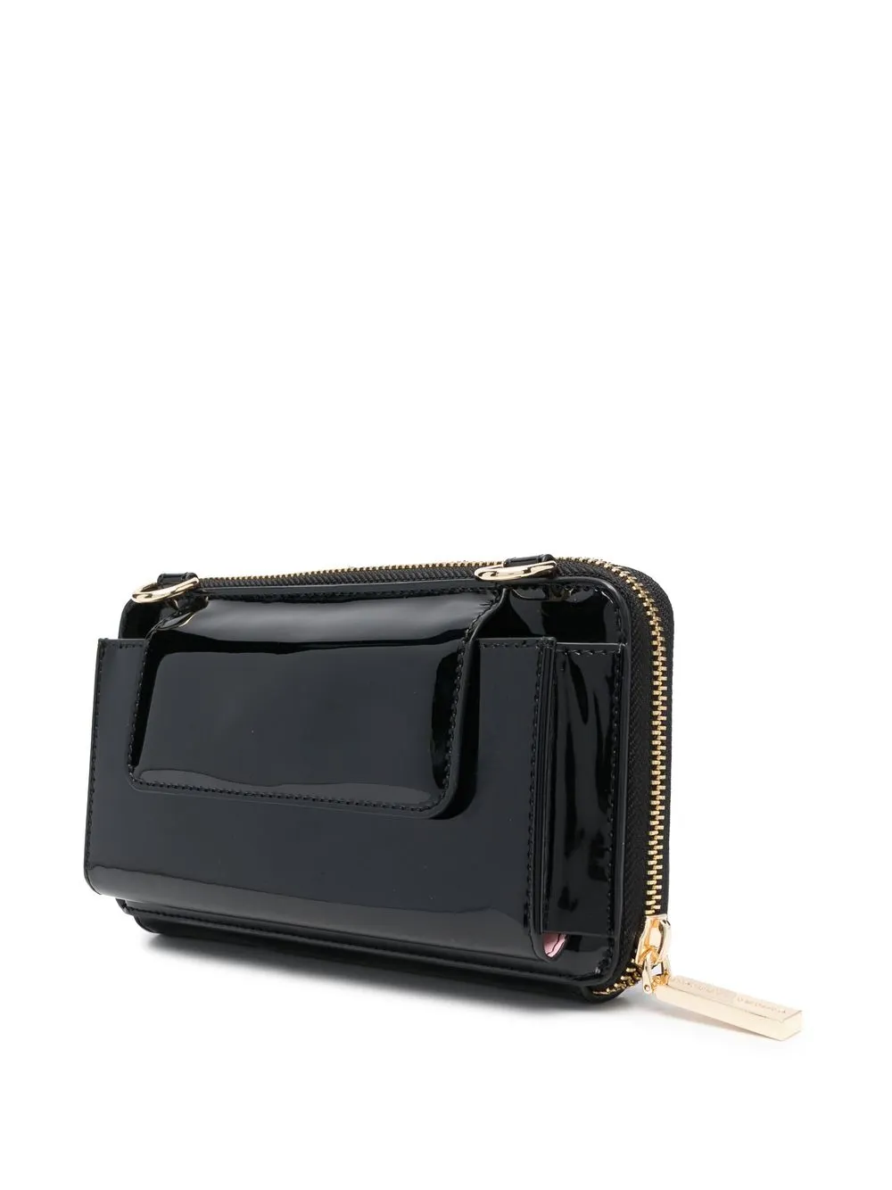 Nero, ricamo con logo frontale, chiusura superiore con zip, tracolla rimovibile con catena, scomparto unico e tasca interna con zip.