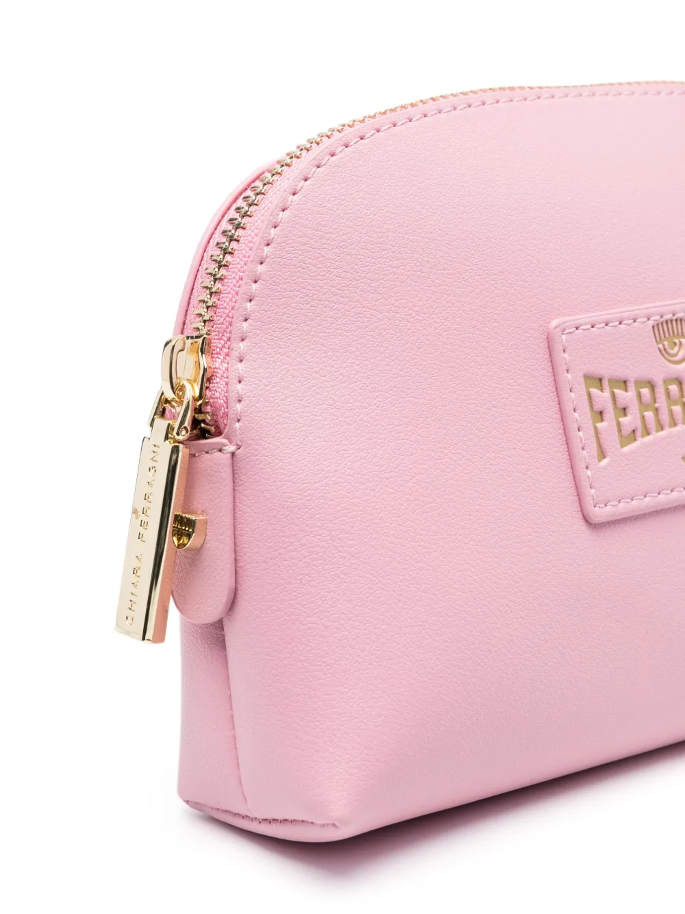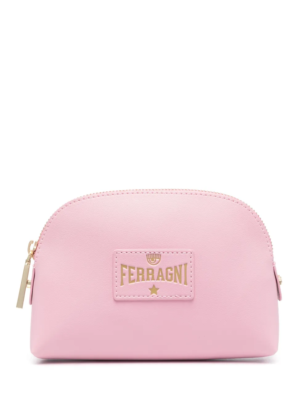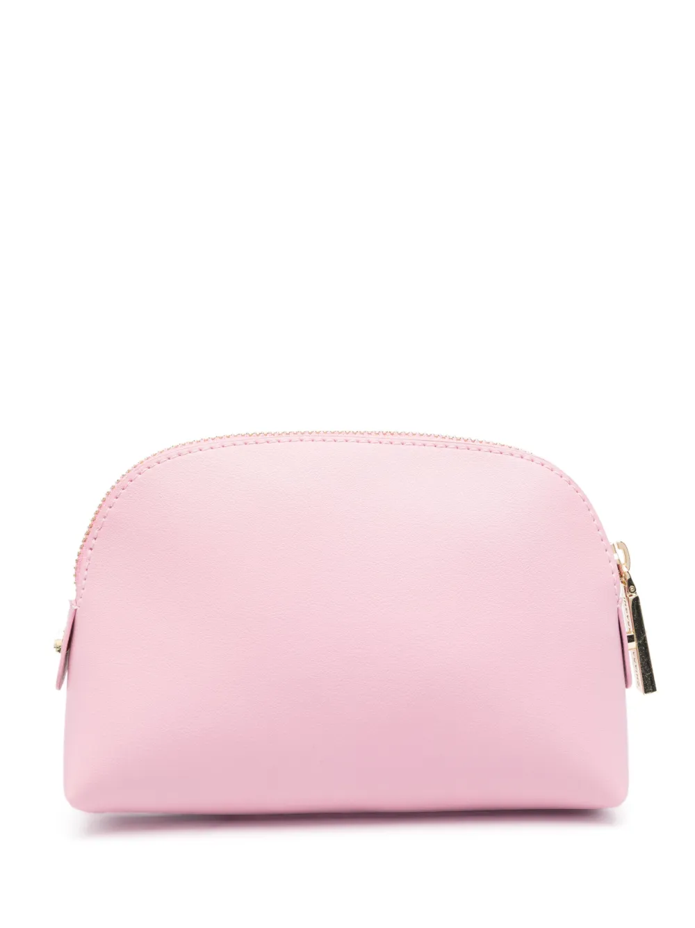Rosa chiaro, applicazione frontale con logo, dettagli color oro, chiusura superiore con zip e scomparto unico.