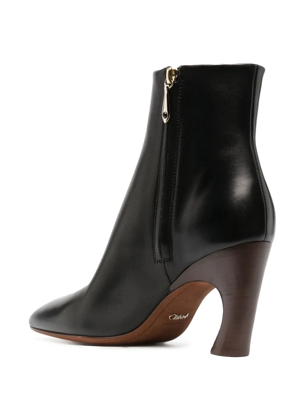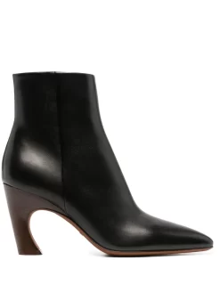 Nero, pelle di vitello, lunghezza alla caviglia, design a punta, chiusura laterale con zip e tacco alto scolpito.