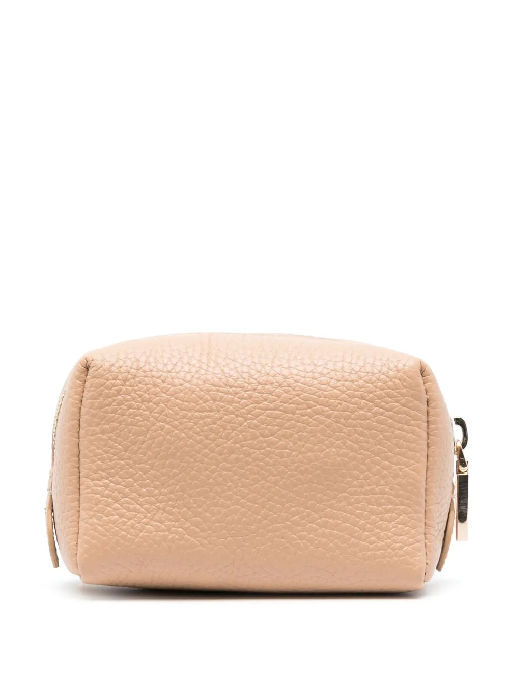 Beige, pelle di vitello, trama zigrinata, logo in lettere color oro, chiusura superiore con zip, scomparto unico e applicazione interna con logo.