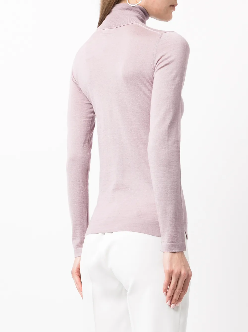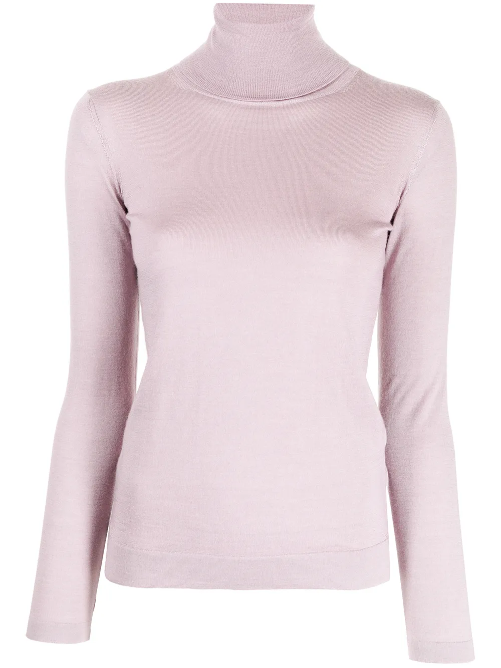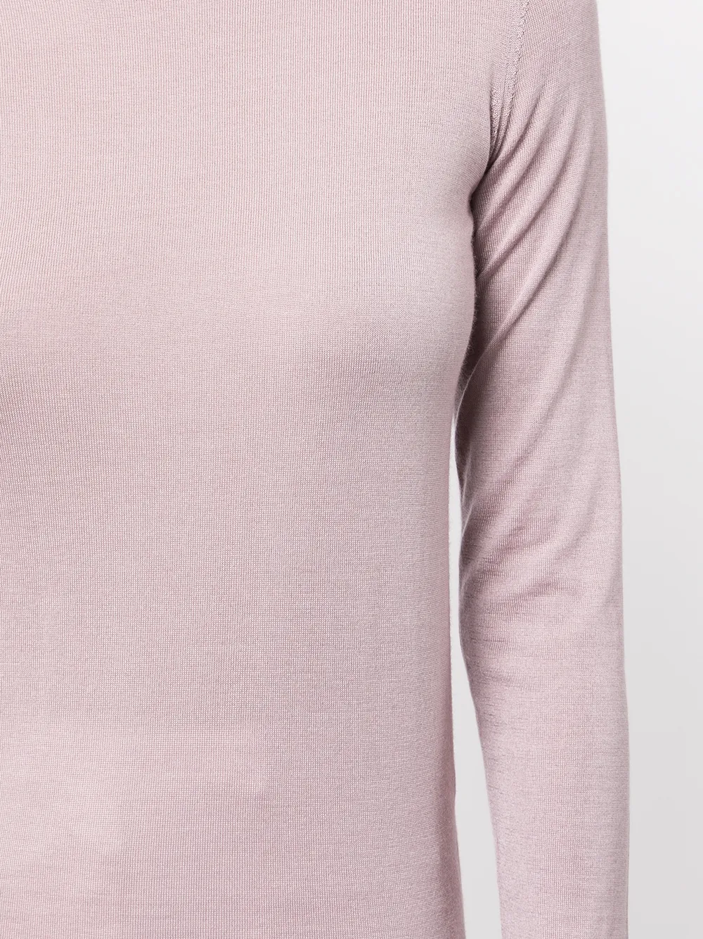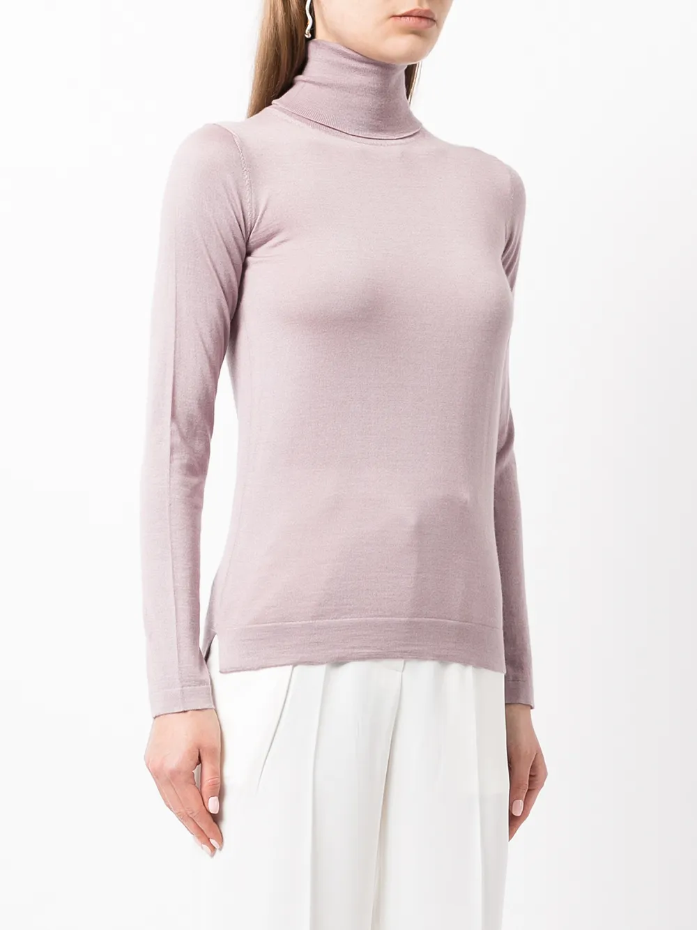 Viola, cashmere, seta, maglia fine, collo alto, maniche lunghe e orlo dritto.