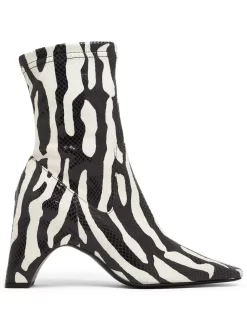 Pelle, stampa zebrata, effetto pelle di serpente, punta quadrata, design pull on e altezza alla caviglia.
