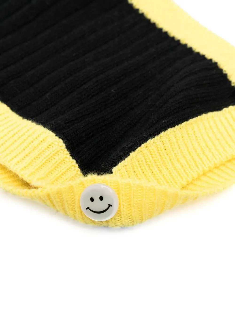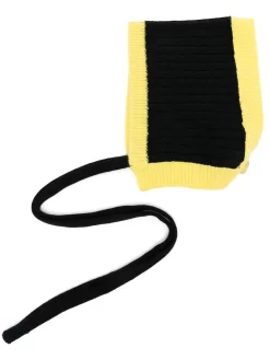 Nero, giallo, lana, lavorazione a coste, design color-block e chiusura con nodo.