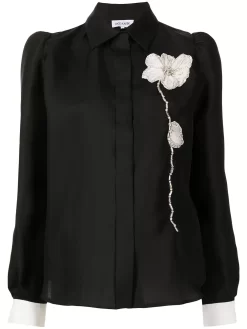 Applicazione a fiori, colletto classico, chiusura a bottoni frontale nascosta, maniche lunghe, orli con bottone e orlo curvo. Materiale: seta.