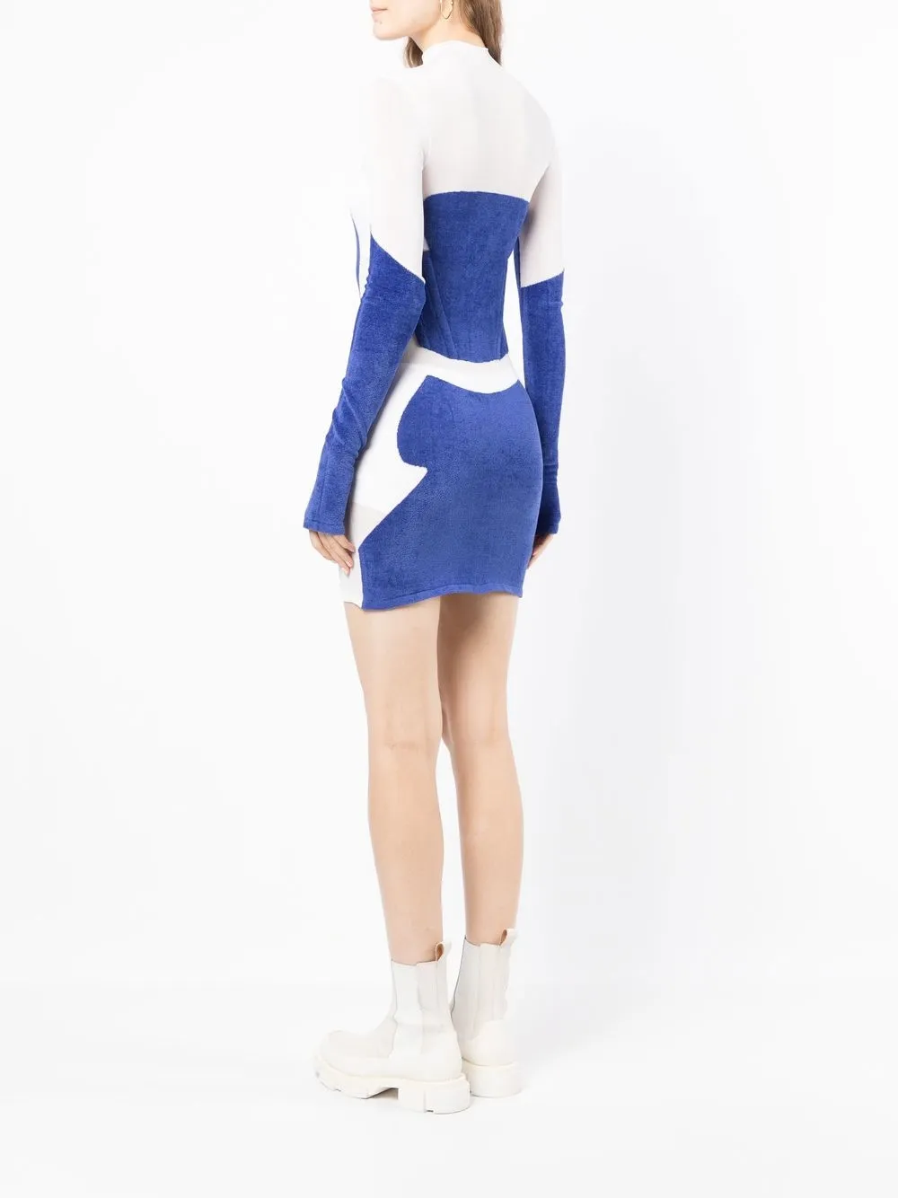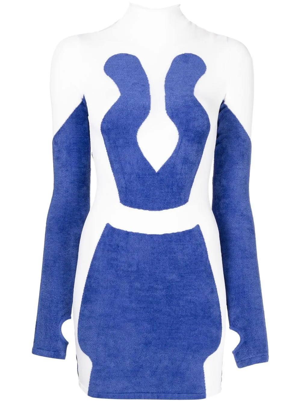 Tonalità bianco avorio, blu reale, maglia fine, effetto semi opaco, collo alto e maniche lunghe.