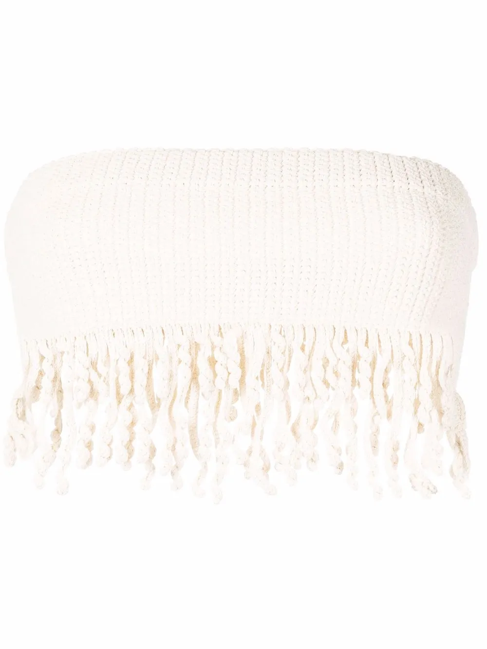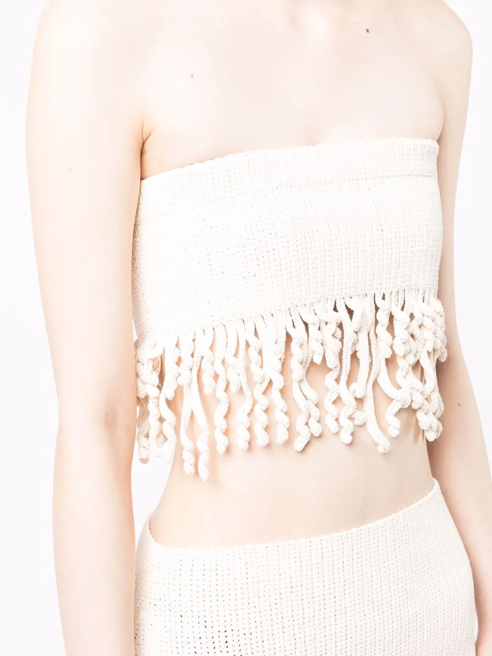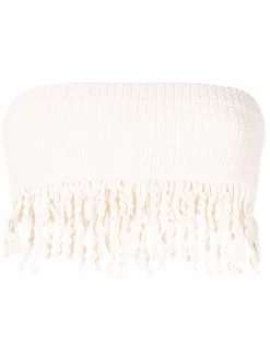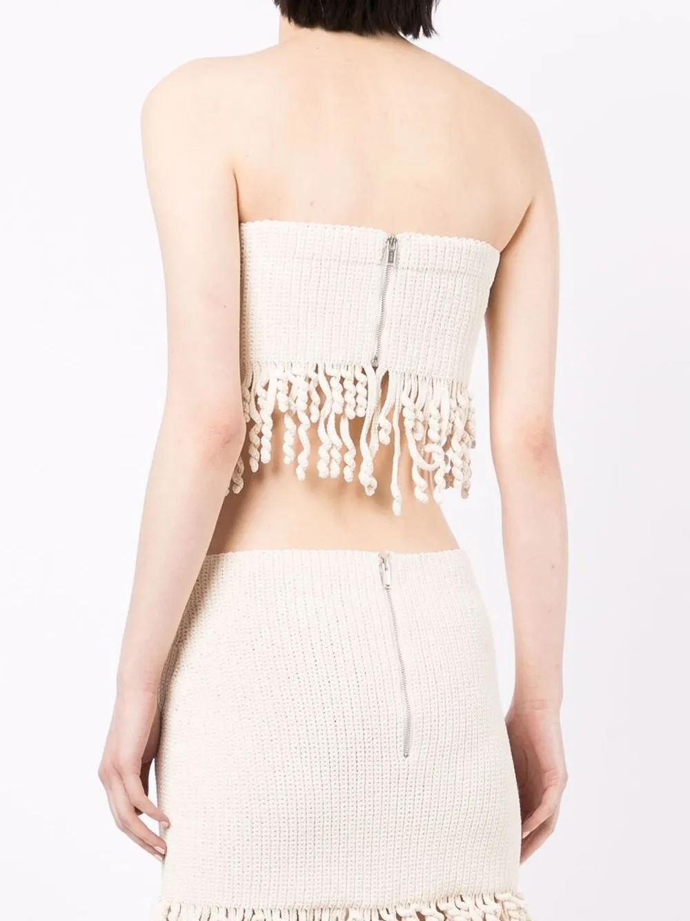 Lavorazione all’uncinetto, senza spalline, dettaglio con frange e chiusura posteriore con zip. Materiale: misto cotone.
