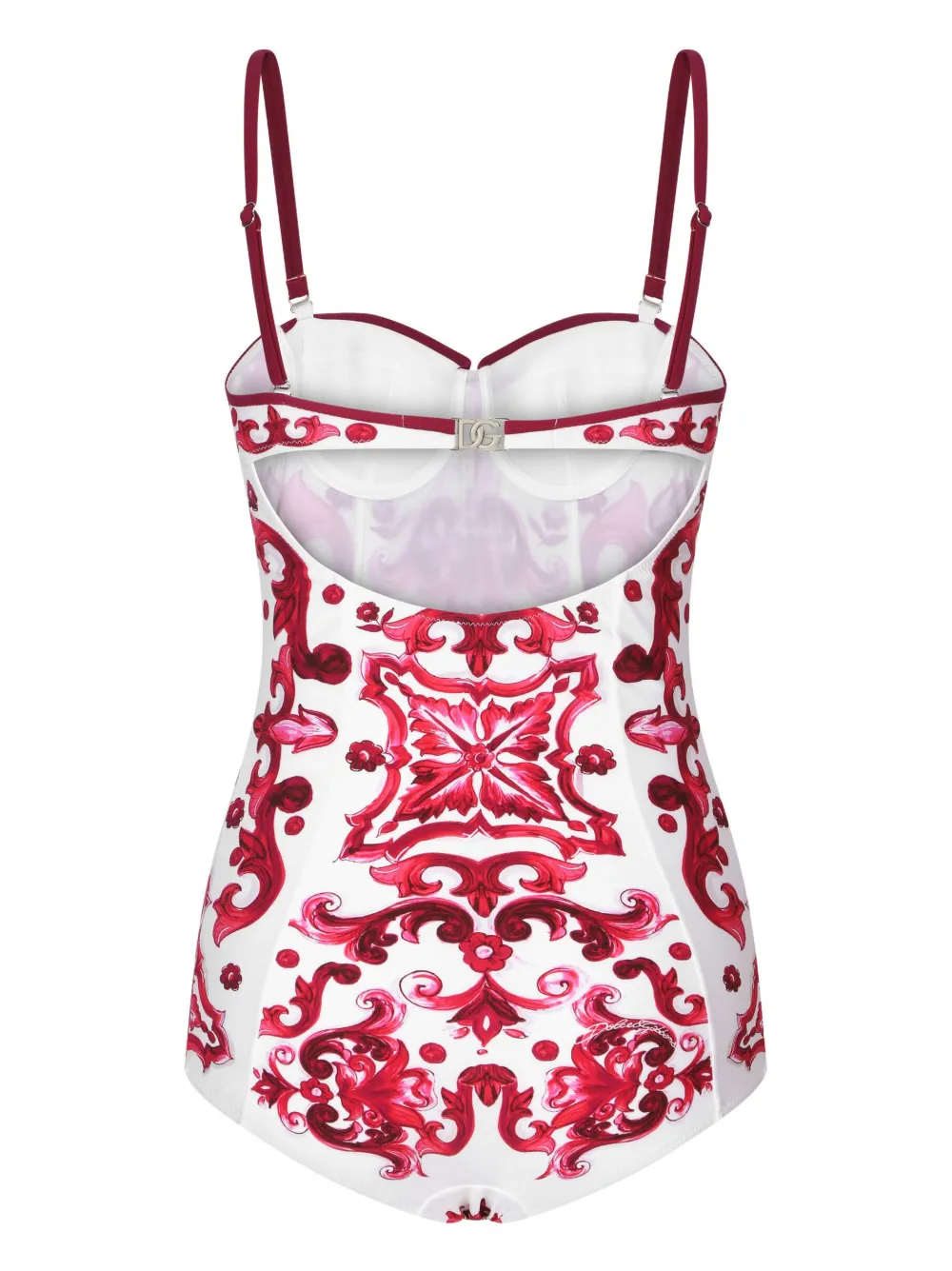 Bianco opaco, rosso scuro, fucsia, stampa maioliche, stile a balconcino, dettaglio cut-out, spalline regolabili e chiusura posteriore con occhiello. I costumi da bagno devono essere provati indossando il proprio indumento intimo.
