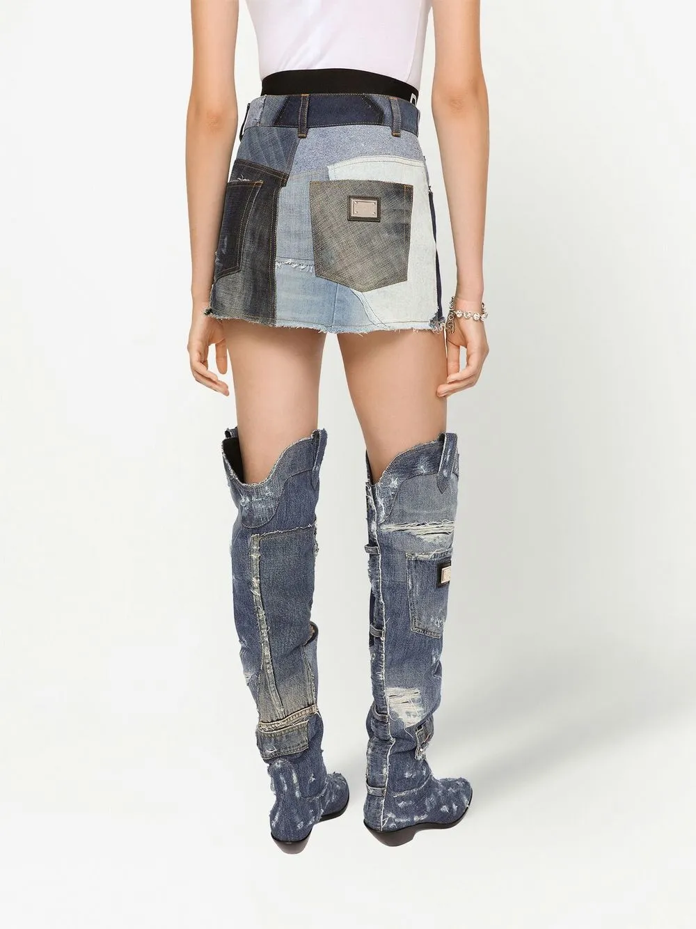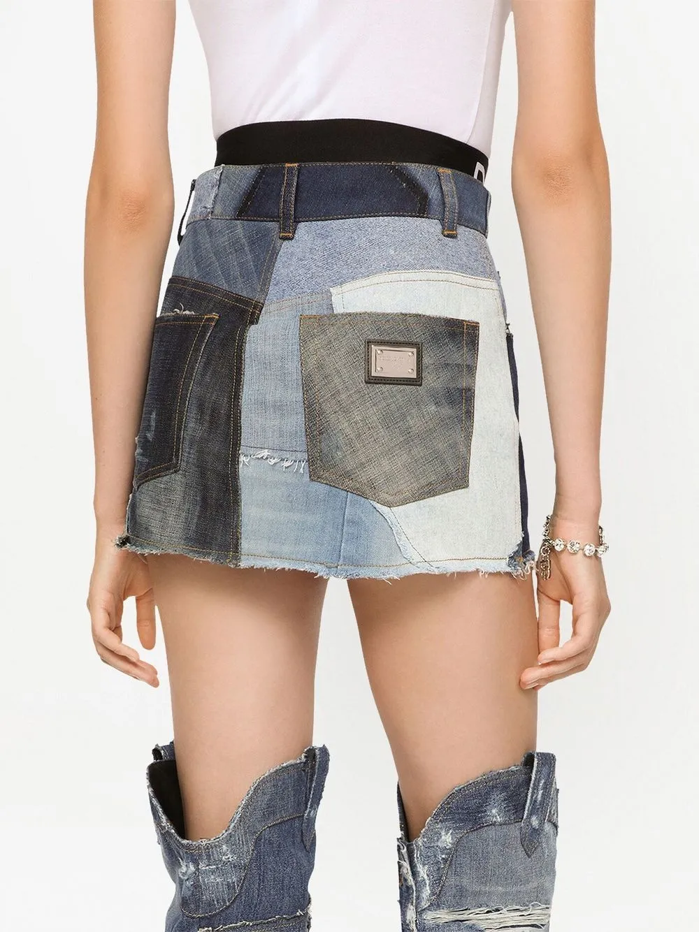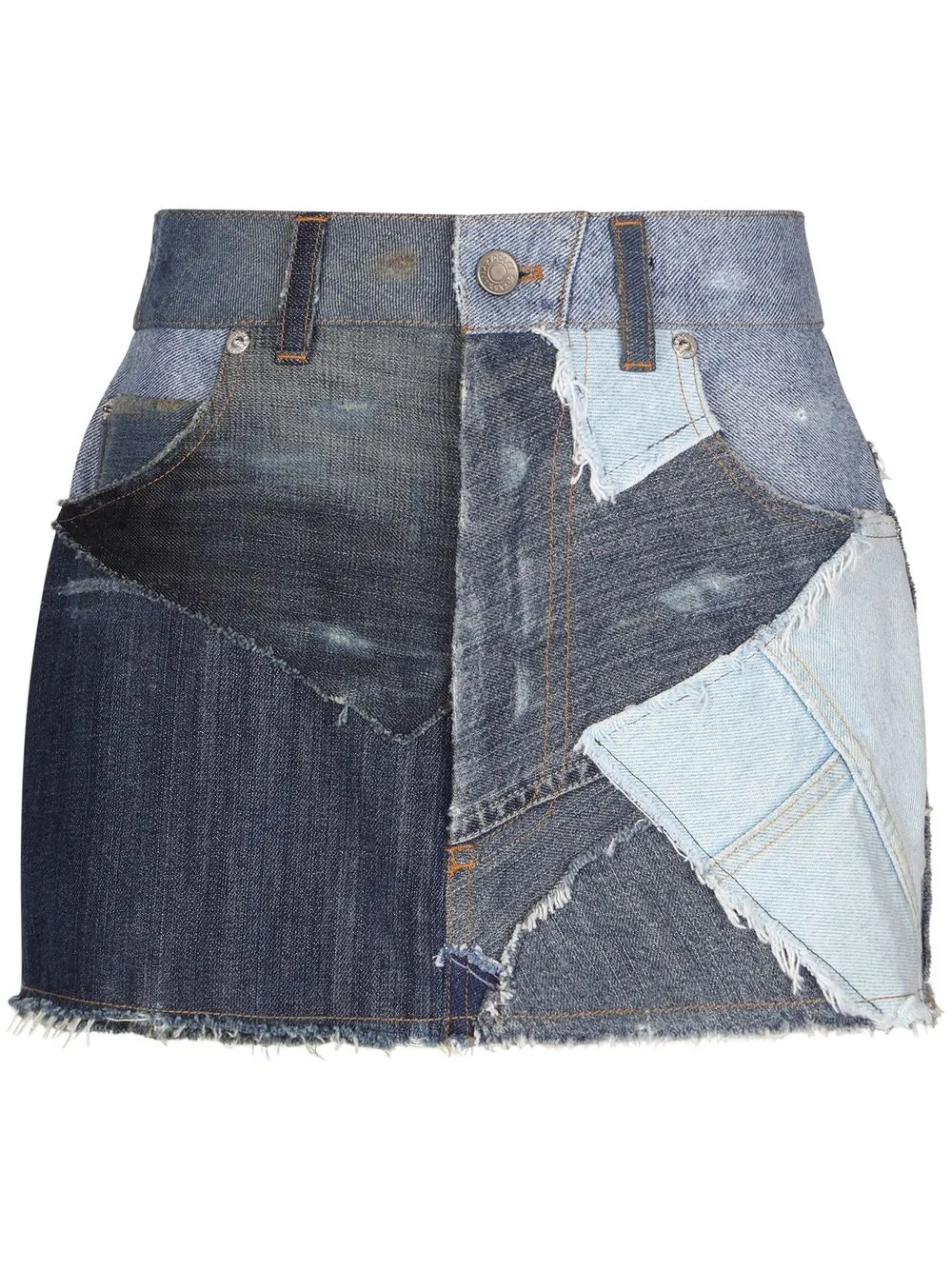 Dettagli sfilacciati, dettaglio patchwork, placca con logo, passanti, chiusura frontale con bottoni e zip, due tasche con inserti, due tasche posteriori sagomate, vita alta e altezza sopra al ginocchio.