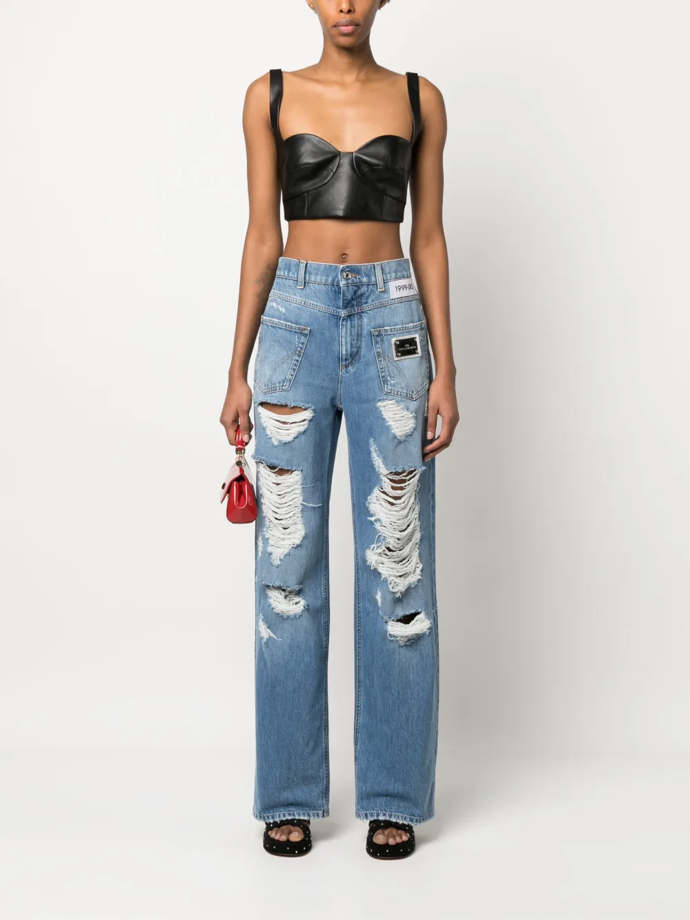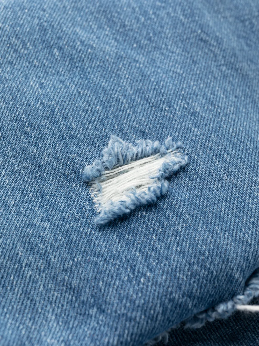 Indaco, cotone, dettagli con strappi, effetto schiarito, placca con logo color argento, vita alta, passanti, chiusura frontale con bottoni e zip, due tasche applicate sul davanti e taglio straight.