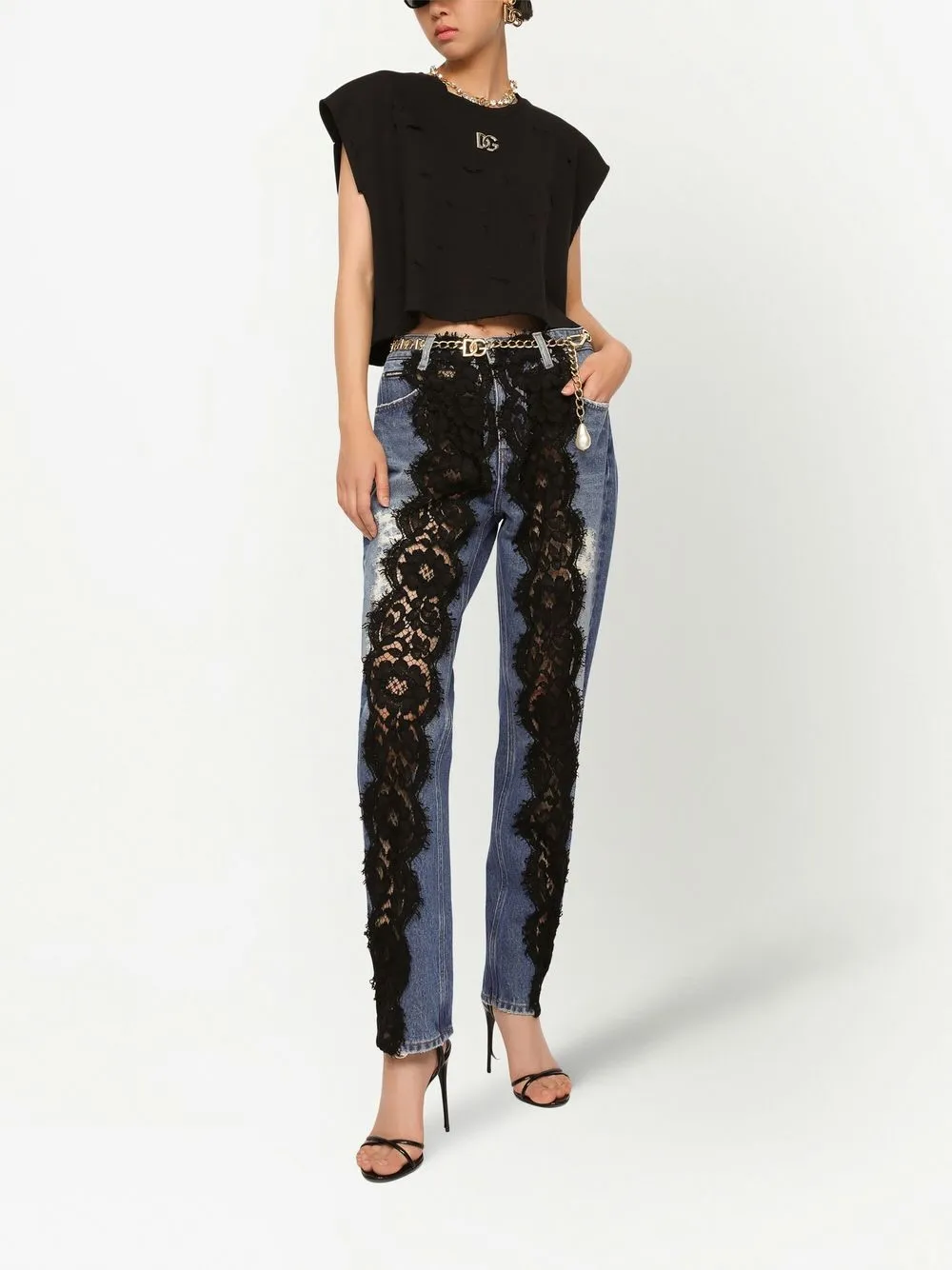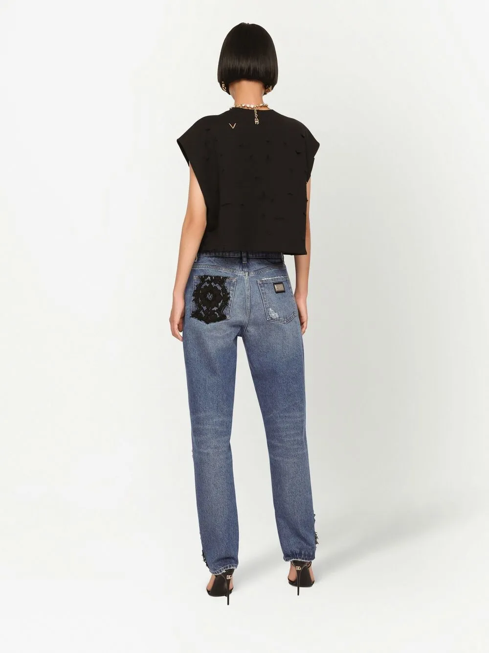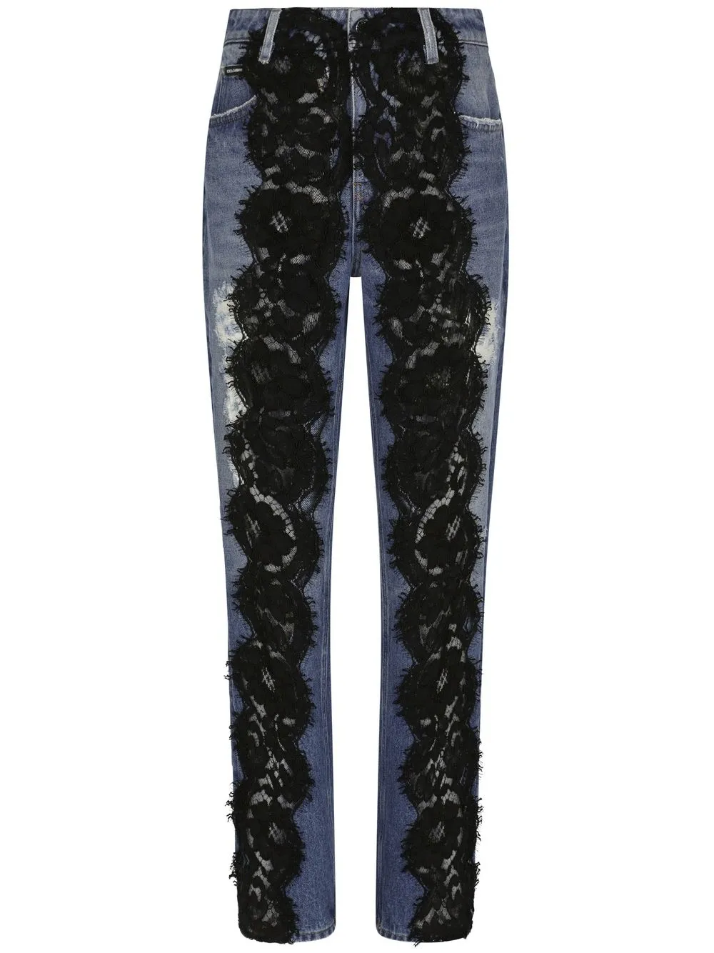 Applicazione in pizzo a fiori, effetto vissuto, placca con logo, passanti, chiusura frontale con bottoni e zip, design classico a cinque tasche, vita alta e taglio straight.